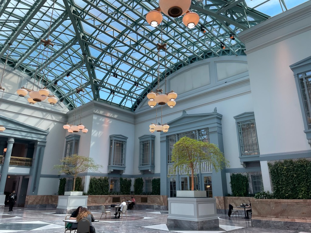 I visited Chicago a couple of weeks ago. There is a quick nonstop flight from Tampa and we arrived around noon. My husband used points from his credit card so we could stay at the Hyatt Regency, which is a perfect location. We could walk to a lot of different places easily, but it was not overly crowded (except when a conference started at our hotel on Thursday afternoon). We wanted to visit the Art Institute of Chicago when we arrived, but it is closed on Tuesday and Wednesday. Instead we decided to take a walk down N. Michigan Avenue and check out the park and visit the Photography museum. Sadly the museum was closed because they were setting up a new exhibit. Instead we wandered through the Chicago Public Library. I loved it. There are nine floors! We went to the top to see the Winter Garden. It was a lovely space that looked like a rooftop conservatory. There were several tables with chairs with trees and lots of space.