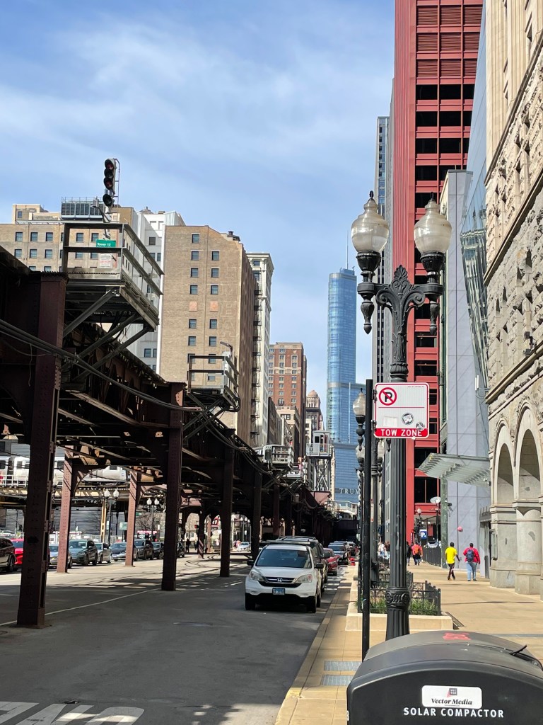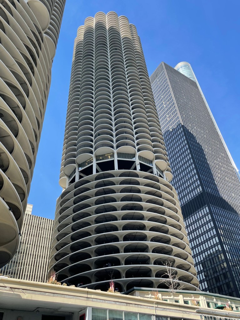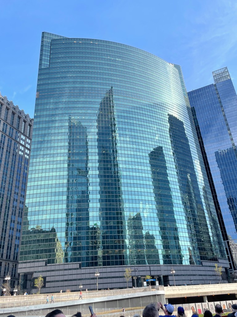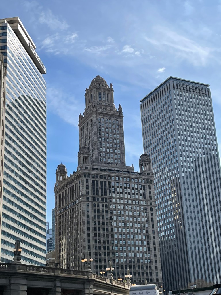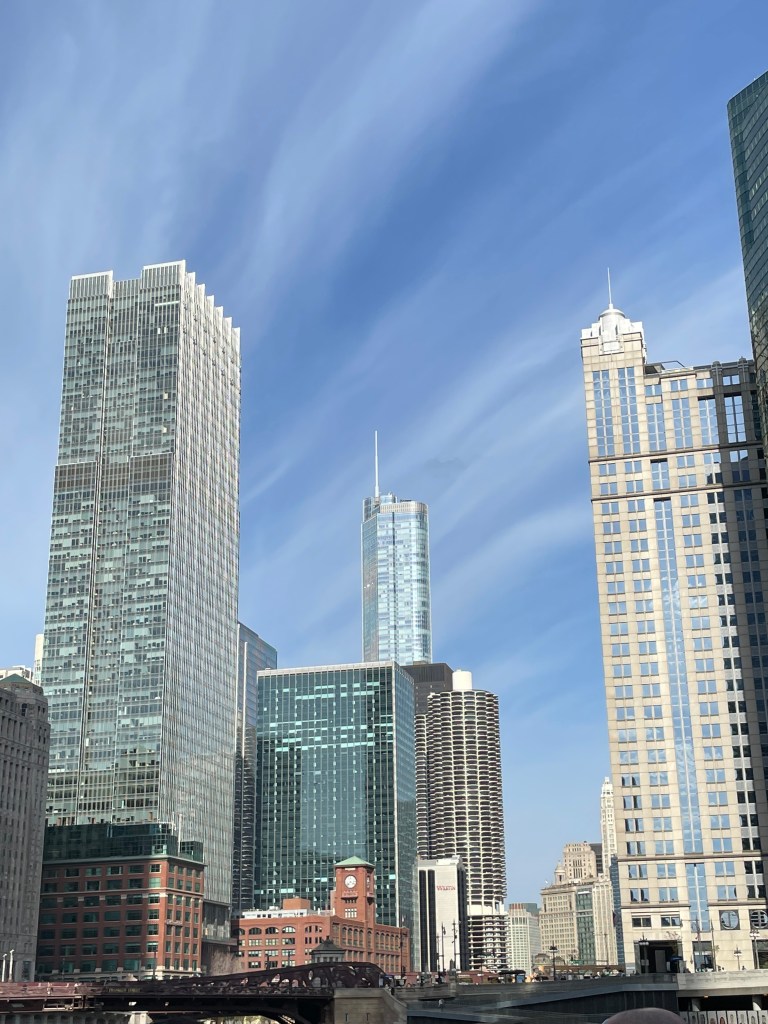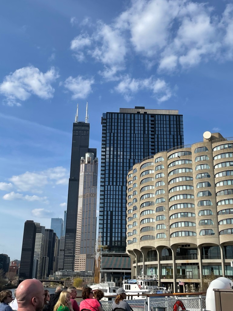 It was unseasonably warm when we were there. We decided to head to the river, across the street from our hotel to take an architectural tour by boat. I’m pretty sure we took Chicago’s First Lady boat tour. It’s the only one that is 90 minutes. You need to go down the stairs at the corner of Michigan and E. Wacker Drive. It was about $55 per person. They are more expensive at night. We got the last tour at 4pm. We decided to sit on the top deck so we could see everything well. The woman conducting the tour was an older lady, who did an amazing job. She didn’t always have her dates right, but the information that she gave us on both the history of Chicago and the architectural designs including the architects was bountiful. It was interesting as well. These are some of my favorite buildings from the river: