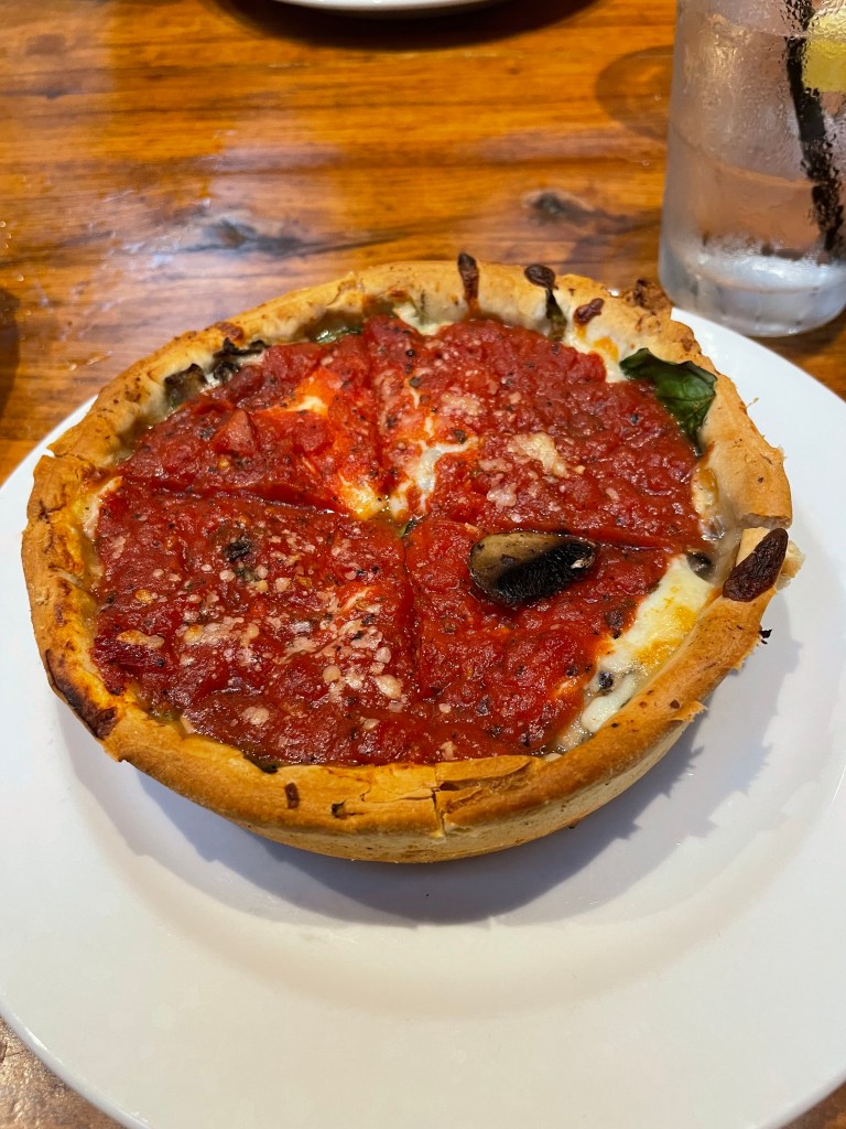 After our boat tour, we decided that we needed to try out Chicago’s deep dish pizza. We went to Giordano’s. They warn you that the pizza would take 40 minutes to prepare. My husband ordered plain cheese and I had spinach and mushrooms. It’s a little strange to eat pizza in which the dough is like a pie crust. I didn’t mind it, but there was a flavor to the sauce like it had sausage in it. It was probably the spices that they used, but it wasn’t my favorite. I did try it!