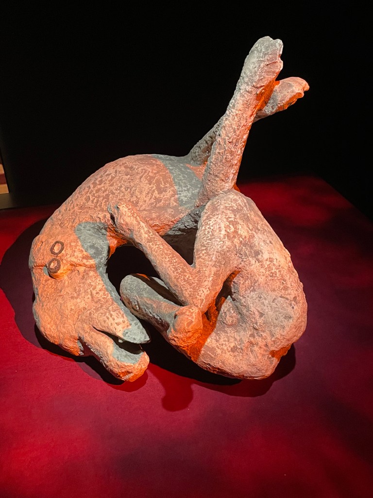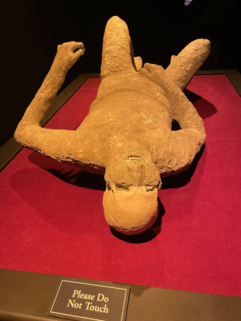 The Pompeii exhibit was really cool. There were a lot of items that had never left Italy. Jef and I have been to Pompeii, but we learned a lot about their society and exactly what happened during the eruption. It was fascinating. I think the cool thing about learning about the past is that it is very similar to today. They had tools and cookware like us and also enjoyed showing off their wealth. There was even a section about graffiti during their time. My favorite part was the bodies. These are not actually the bodies, but the space that was left from where they turned to ash. The one above is special though because it still has part of the skull and teeth. I’m not sure how it survived. The picture below is of a guard dog. He was still on duty during the eruption.