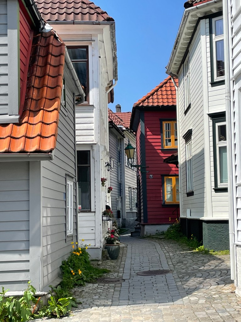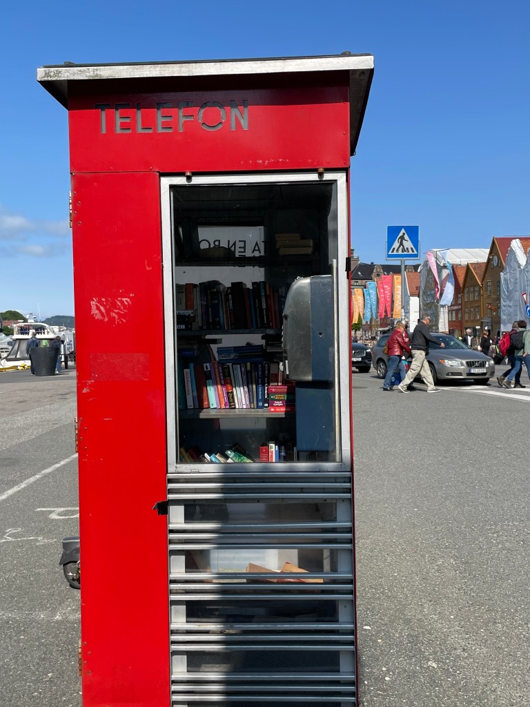 On the way back to the boat we wandered through the fish market again. I thought I might want to try something, but the crowds were even thicker than before and I was not craving anything I saw. The other neat thing we saw in Bergen was a converted telephone booth into a lending library. The city itself was very beautiful and I enjoyed the winding streets lined with cobblestones.