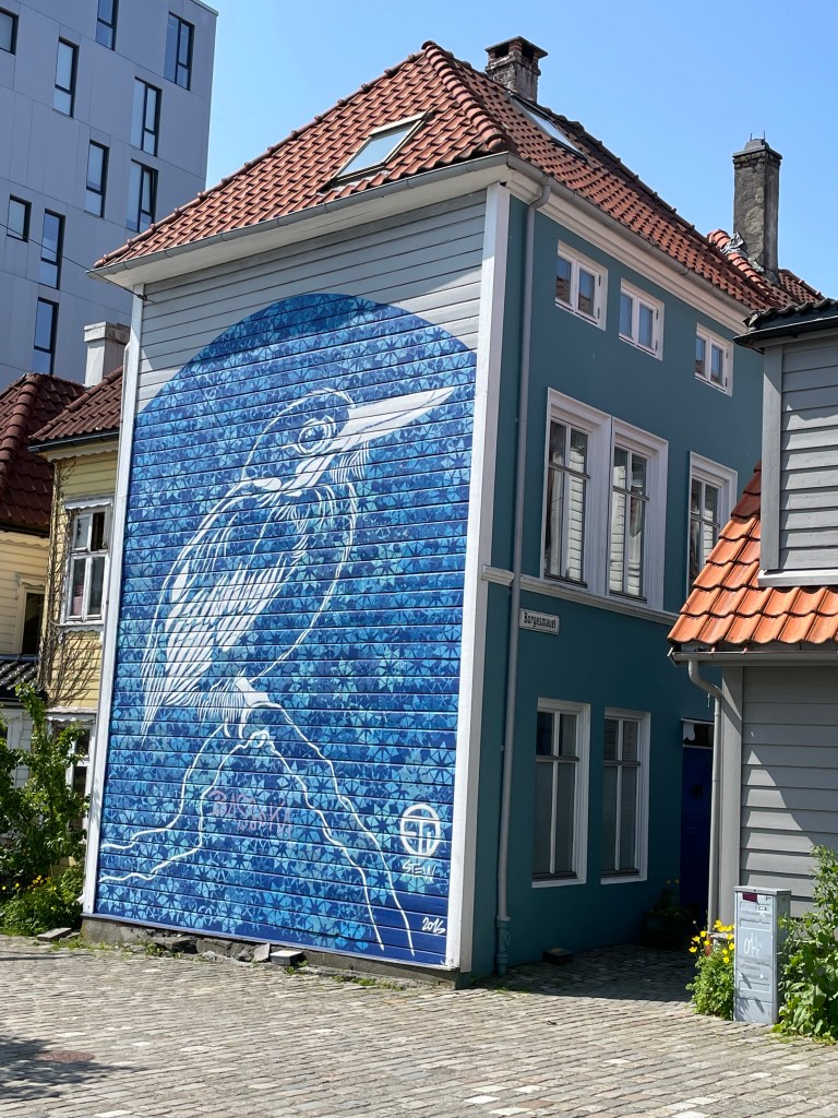We then walked to the Bryggen dock with all the wooden houses. Several of the houses were under renovation. It was neat because you could look in the windows to see what they were doing. In one of the houses you could see the long wooden beams with bark still attached being fitted. I can’t read Norwegian, but it appeared that the houses were leaning too much and had to be straightened. I would guess that it may have something to do with being right on the salt water and the fact that the houses were built in the 1700s. We wandered around the alley ways looking into the shops. We passed a bakery that smelled delicious, so we went inside and bought a cinnamon roll. It was very doughy and different from the twisted one we had in Flam. I liked the twisted one better, but this bready one was tasty too.