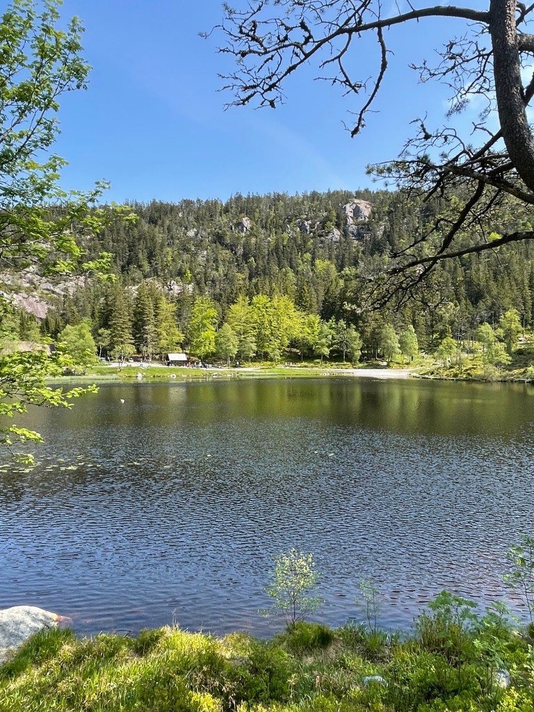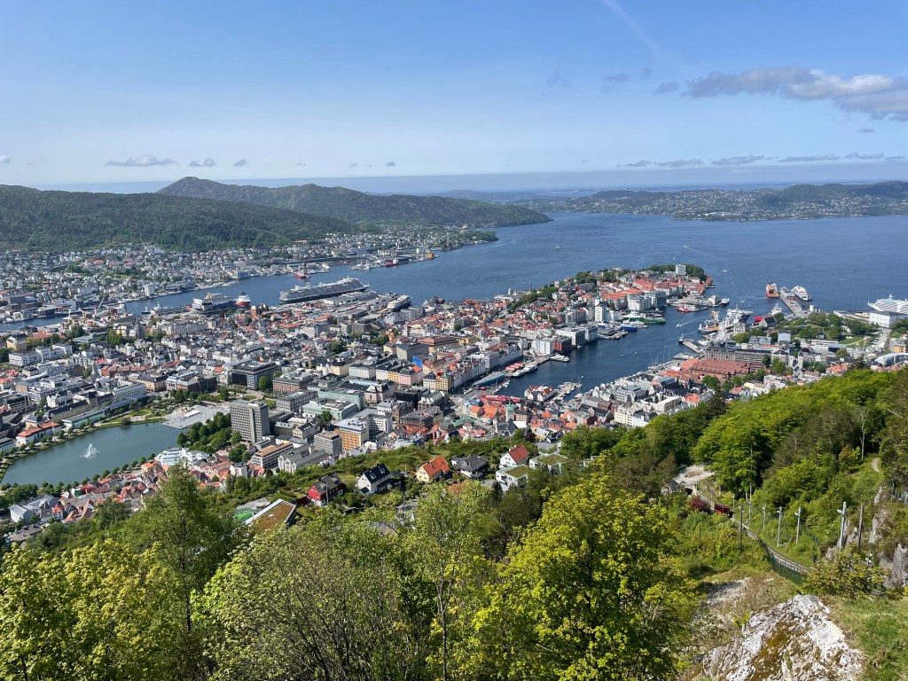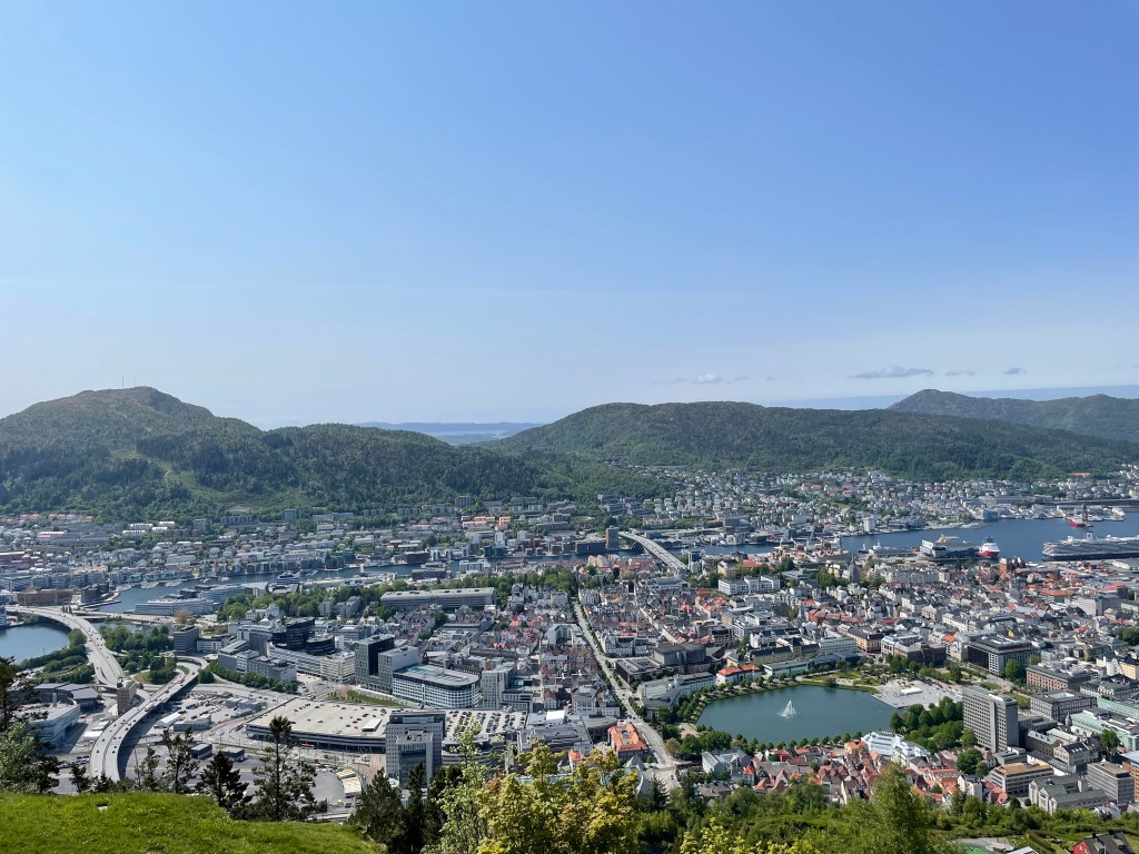 The views from the top are spectacular. We could see everything clearly, including the seven mountains that surround Bergen. We decided to hike over to a lake that was up on the top. It only took about 10-15 minutes. We almost took a much more difficult trail back, but turned around last minute and stuck to the trail we already tread. The lake was calm and you could see right to the bottom. There were a few ducks swimming. After returning to the area near the funicular, we sat for a few minutes for a phone call. There was a store, cafe, ice cream shop, and playground for the kids. There were several hiking trails and one went all the way to the city center (it was about 3km).