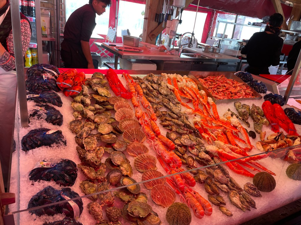 The first destination was the fish market or torget (as it is called here). We wandered through the stalls outside marveling at all the different types of seafood you could purchase including whale! There were also several stands with elk and moose meat as well as donuts, ice cream, and other international foods. We missed the indoor market at first, but wandered through on the way back to the ship. It was very crowded and tough to navigate. It was mostly for people to sit and eat.