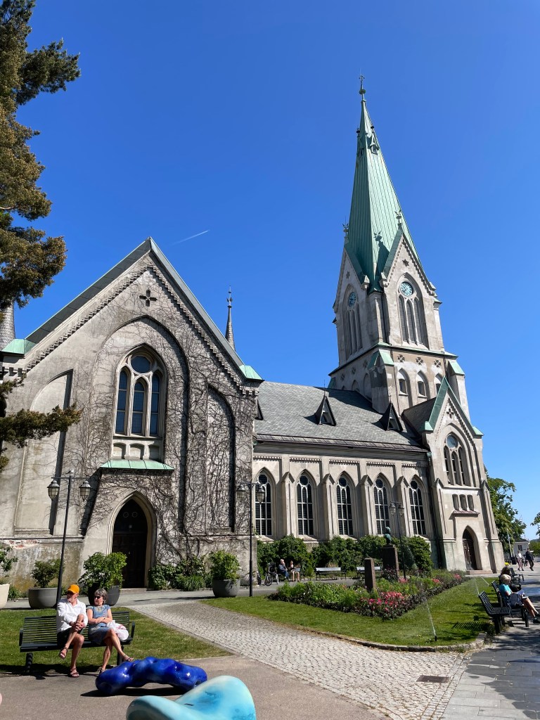 This city is not to be confused with Kristiansund, which is in northern Norway. We are now in southern Norway. We disembarked from the ship around 10am. We walked by the performing arts center, which our port profile onboard likened to a building with troll hair. I liked it.