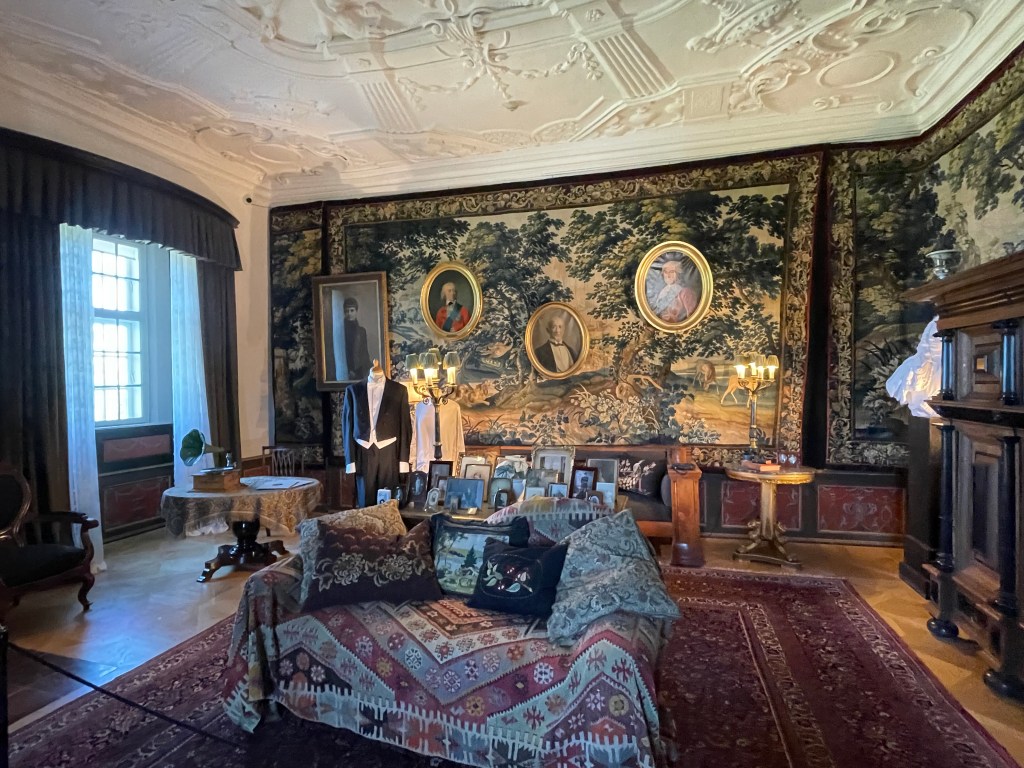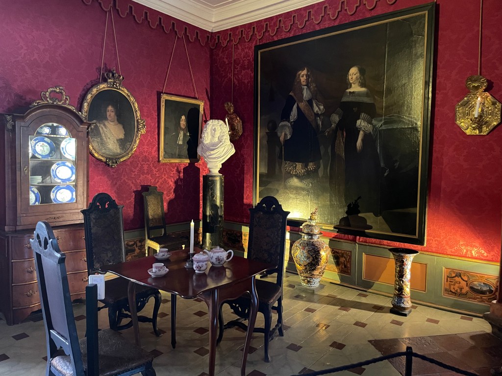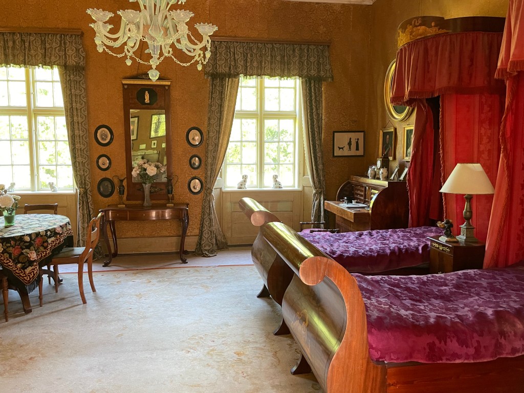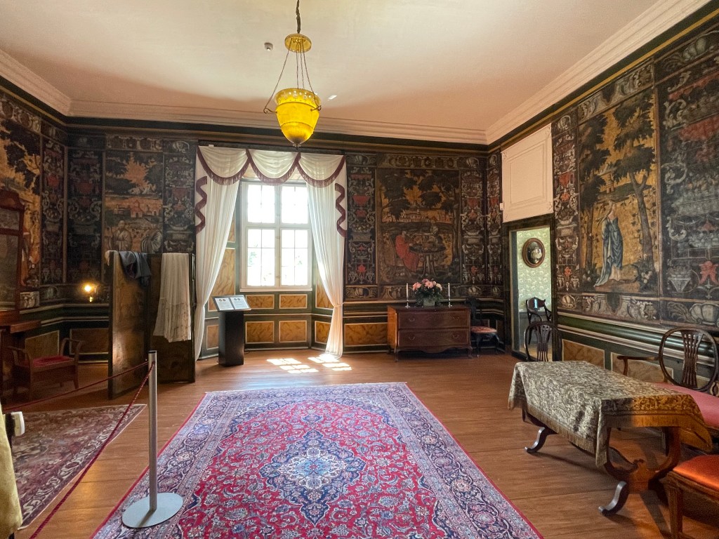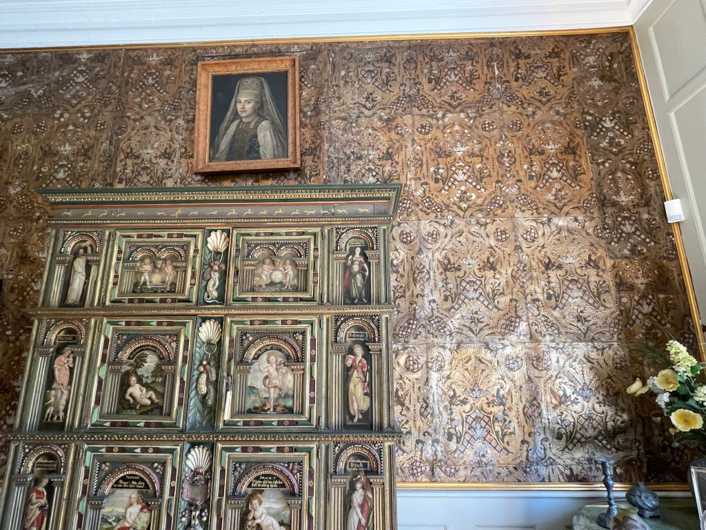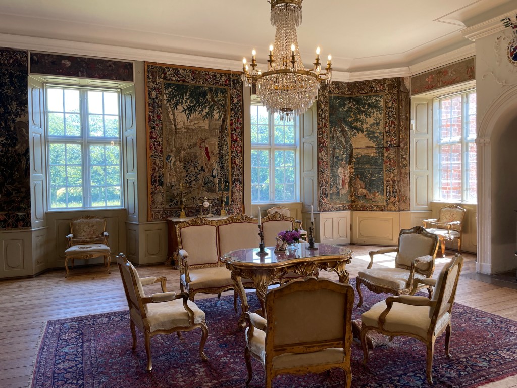 Our tour guide gave us a lot of information about Denmark while the bus drove through the countryside. She said that we could walk around with her in the manor house and she would give us information about each room or we could go on our own. We could get free cake along with tea or coffee around 1:20 and we had to be back on the bus at 1:50. We didn’t have a lot of time to see many things. We were the most interested in the house. We decided not to stay and listen to the guide. Each room had an explanation that we could read. Our group was about 33 people and we wouldn’t be able to get clear pictures if we stayed with the guide. It turned out to be an excellent idea. We had to walk through two other groups speaking another language off and on, but it was otherwise pretty empty.