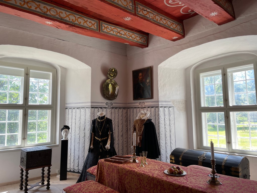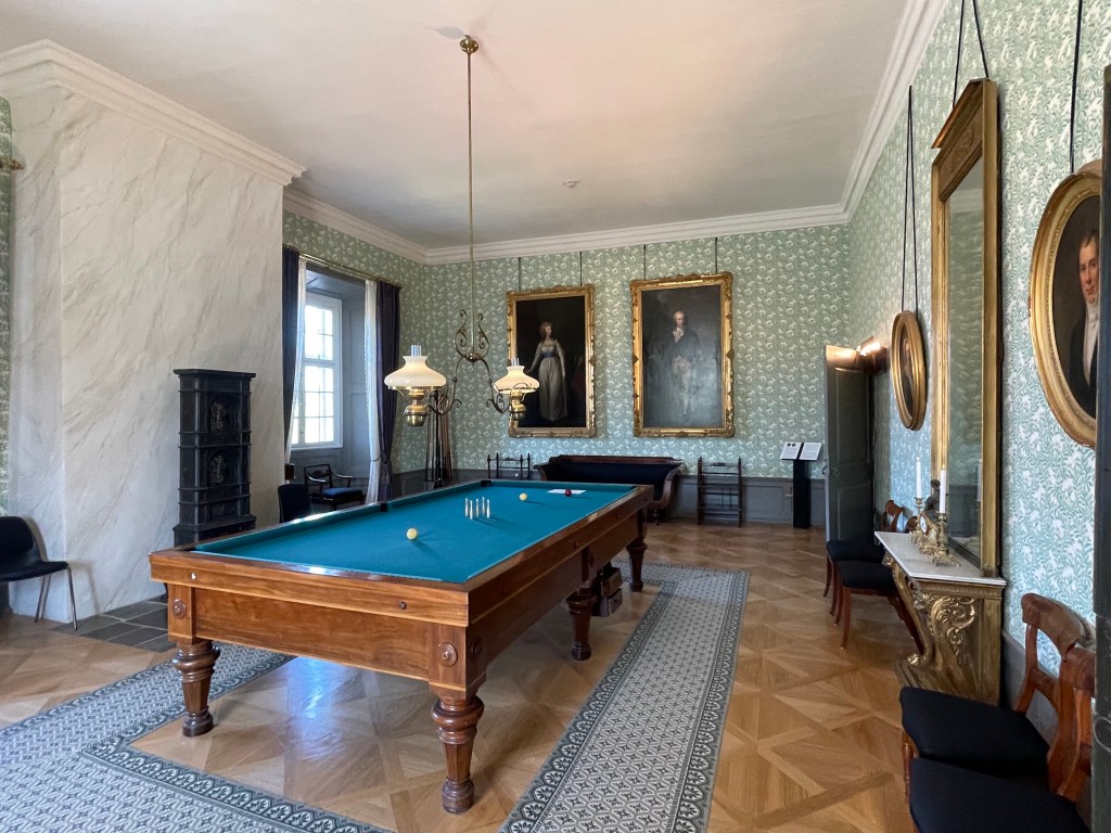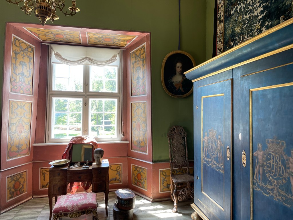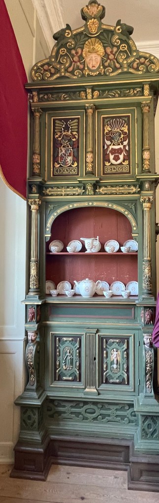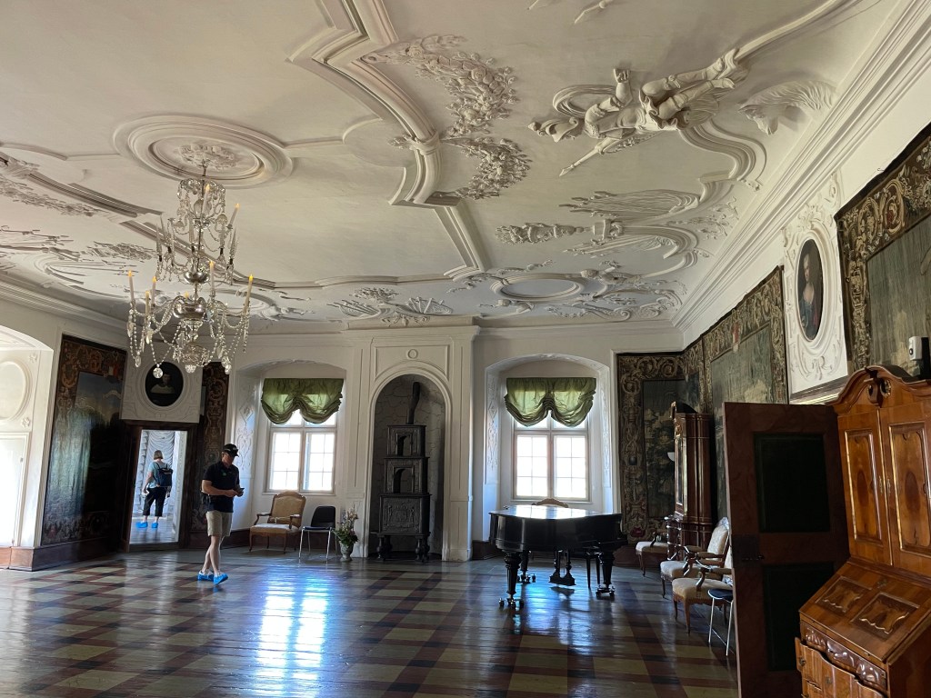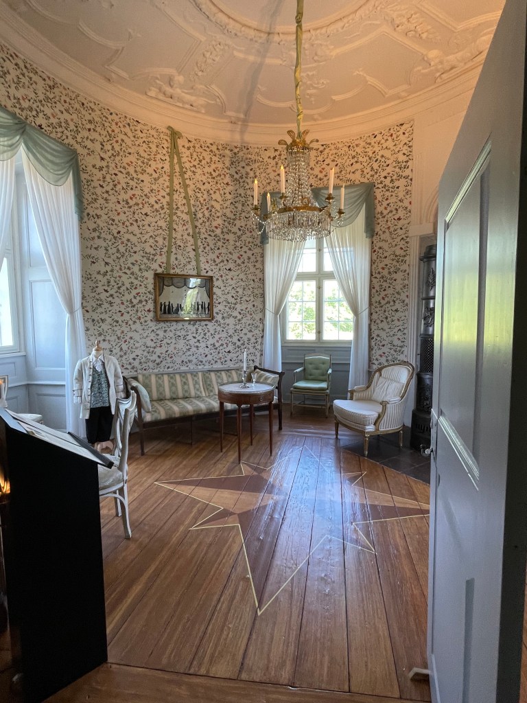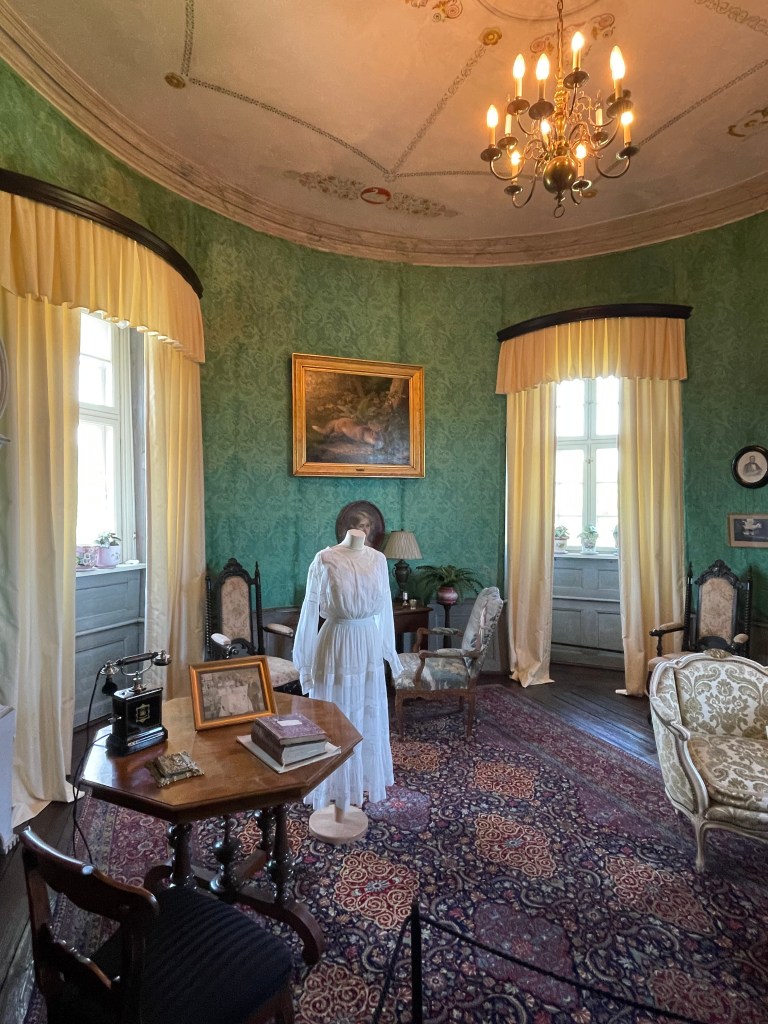 Our tour guide gave us a lot of information about Denmark while the bus drove through the countryside. She said that we could walk around with her in the manor house and she would give us information about each room or we could go on our own. We could get free cake along with tea or coffee around 1:20 and we had to be back on the bus at 1:50. We didn’t have a lot of time to see many things. We were the most interested in the house. We decided not to stay and listen to the guide. Each room had an explanation that we could read. Our group was about 33 people and we wouldn’t be able to get clear pictures if we stayed with the guide. It turned out to be an excellent idea. We had to walk through two other groups speaking another language off and on, but it was otherwise pretty empty.