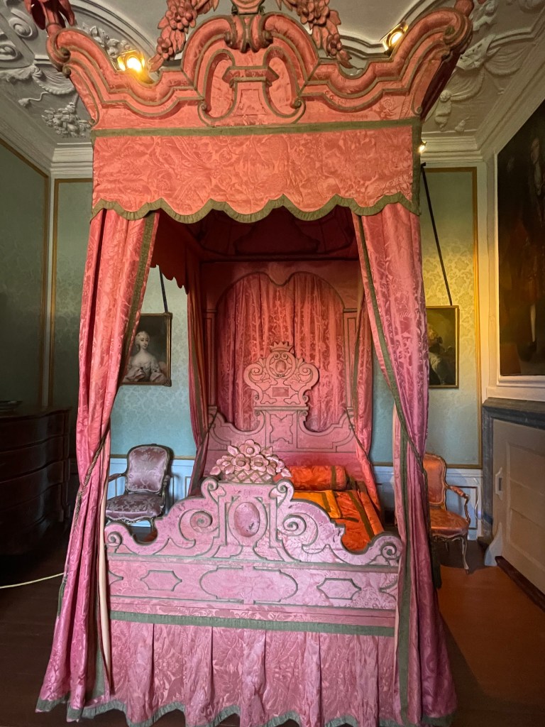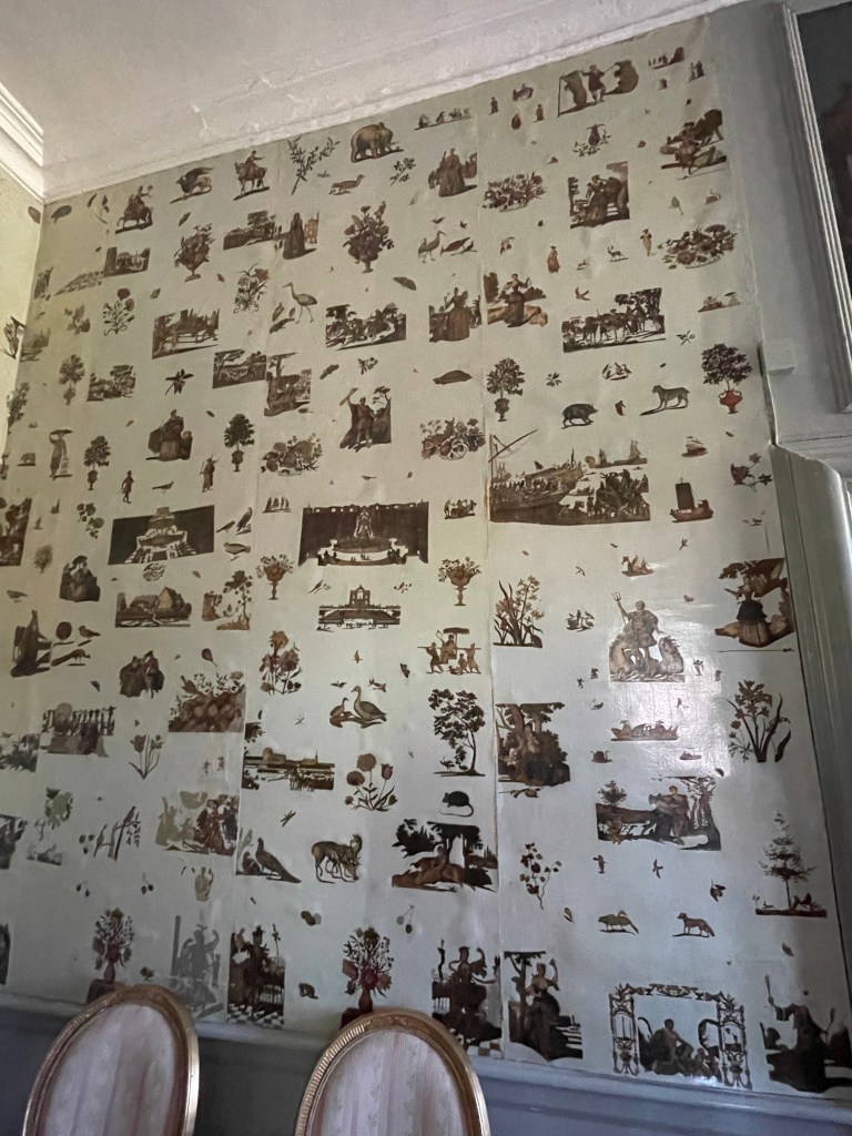 I found it interesting the the Count’s Bedroom was right off the dining room. He also had portraits of both his wives on the walls of his bedroom. The first wife died in childbirth and he did not have any children with his second wife. I’m not sure how happy I would be to have my husband’s first wife on the wall next to his bed. The small cabinet off of the count’s bedroom had this cool wallpaper that has been there for over 280 years! Talk about durable!! It looks like when you cut pictures out of magazines and put them on your wall. I thought it was pretty neat.
