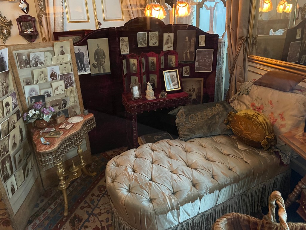 The queen’s drawing room was huge and had several different areas dedicated to different past times. She like to paint (two of her flower paintings were on the walls). I loved her chaise lounge, which was a favorite place for her to relax.