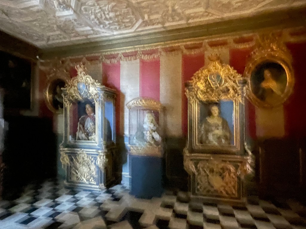 I don’t have a picture of his bedroom, probably because it was dark all that was in there was a display case of his bloodied clothes from battle. However, I did get a picture of his bathroom (there were three in the castle) because I thought the tiles were awesome. I have a picture of the garden room because the striped wallpaper and screen. In the dark room there are wax figures depicting Federick III, Queen Sophie Amalie, and their son, Prince George. (Sorry the picture is a bit blurry, I was trying to take it before someone walked in front of me.) It was kind of creepy, honestly.