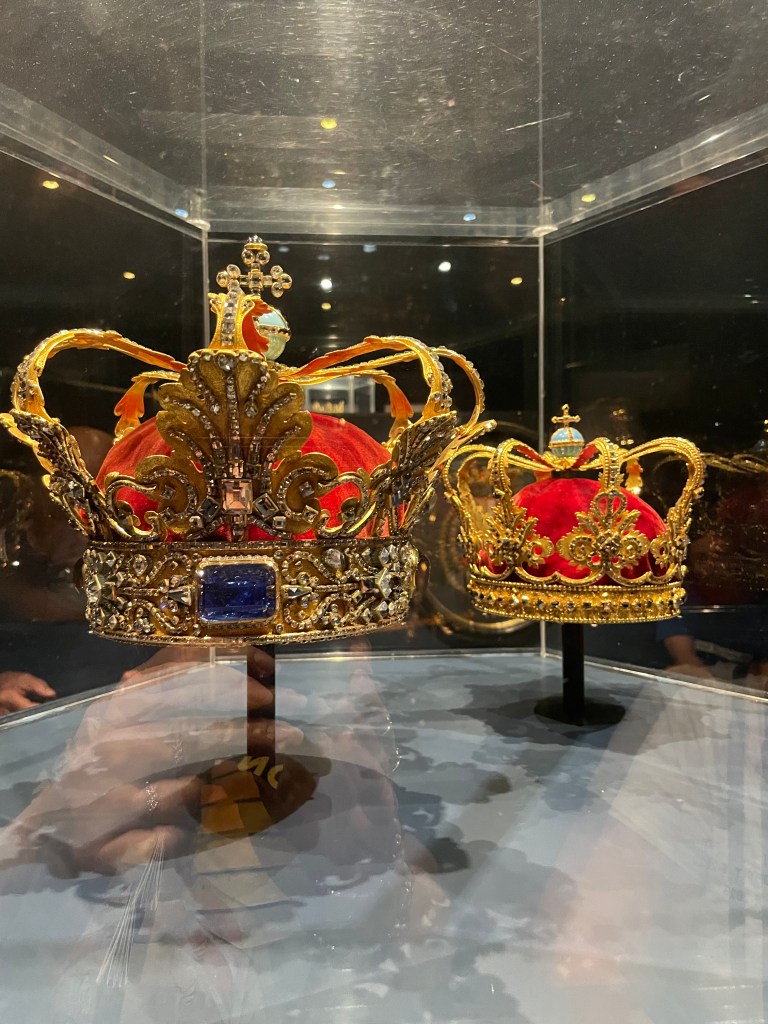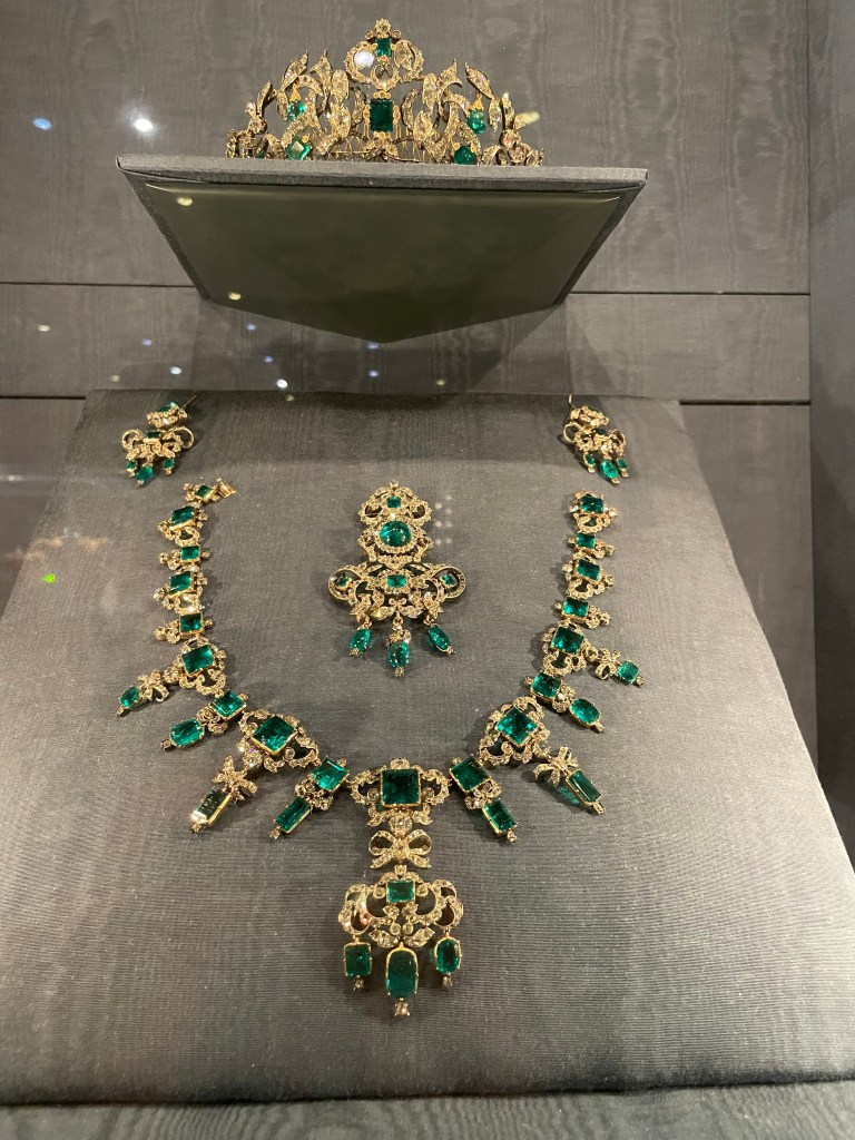 After getting dizzy coming down the winding stairs, we had to go outside to get into the basement. There are two levels to the basement. It was then I realized why there were two men patrolling the area with machine guns. We were going down to check out the Crown Jewels and other treasures of the royal family. There was one room filled with beautiful carvings from ivory, a room with weapons, one with wine (from the 1600s!), one with riding gear and glass items, and one with astronomy equipment. In the lower level you could find the Crown Jewels including the crowns. I only took a picture of the emeralds (because I liked them the best), but there are also pearls, rubies, and diamonds.