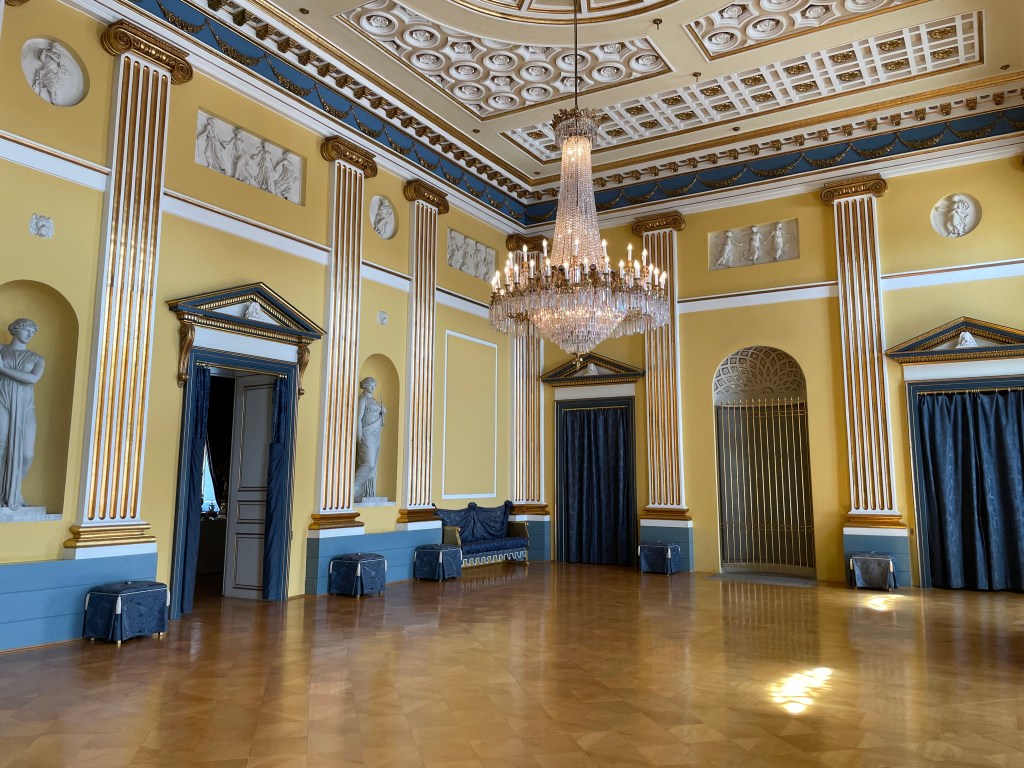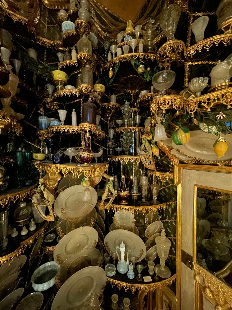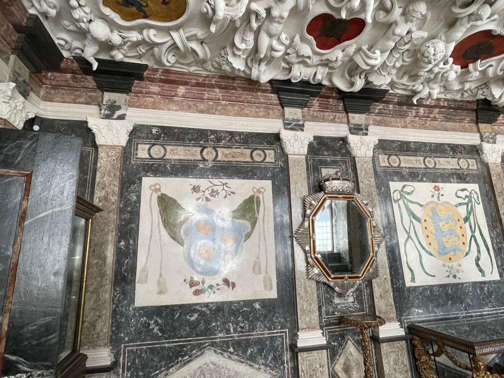 The second floor has the great hall with only three small rooms off of it. The porcelain cabinet was closed to the public, but the glass cabinet and the regalia room was open. The great hall has the three silver lions that have guarded the thrones since 1670. The thrones themselves are made of narwhal tusk and silver. Federick IV visited Venice in 1709 and the city gave him a collection of glass, you can see the display of it in the glass cabinet. This picture is the same arrangement of glass that was done in 1714.