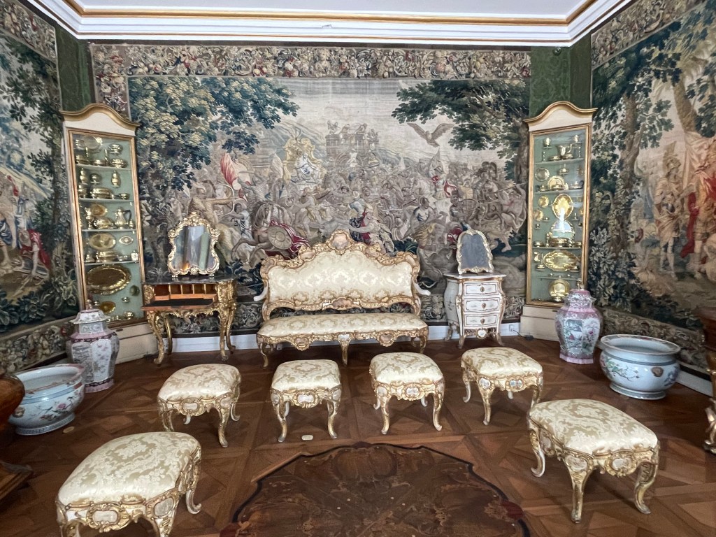 We then went upstairs to what they call the first floor. In the room you enter from the staircase, called The Rose, there is this amazing walnut cupboard which has a mechanical orchestra inside that still works. I’m not sure which room is the red walled room, I think it’s the Princess’ lacquered chamber with Chinese lacquer all decoration. I thought the wood floor was really well done. I am unsure about the room with all the tapestries, but I think that it may be Federick V’s Cabinet. I think that room is really well done with all the white furniture.