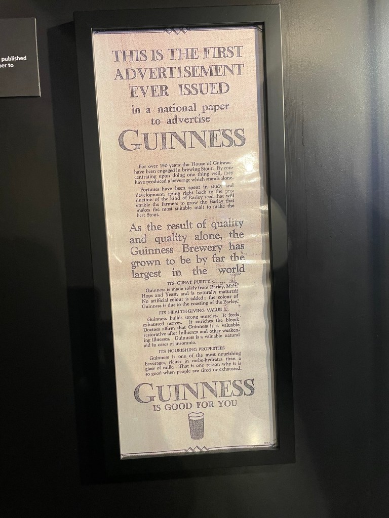 Although we could have walked to the Storehouse, we wanted a break, so we took an Uber. It was expensive for just a few miles. The “tour” experience was very strange. I have been to a lot of breweries around the U.S. and this was so manufactured. There were displays and videos to watch on each floor and then you took an escalator up to another floor to see more stuff. For example, one floor was about the brewing process and had a waterfall, another had a bunch of wooden barrels and had a video showing how to make them. They did have one room for tasting and someone explained the different flavors (which you could smell from barrels in the room) and then they explained how to taste a Guinness. That was a nice interactive portion. One floor had all kinds of advertising from the company, which I found the most interesting.