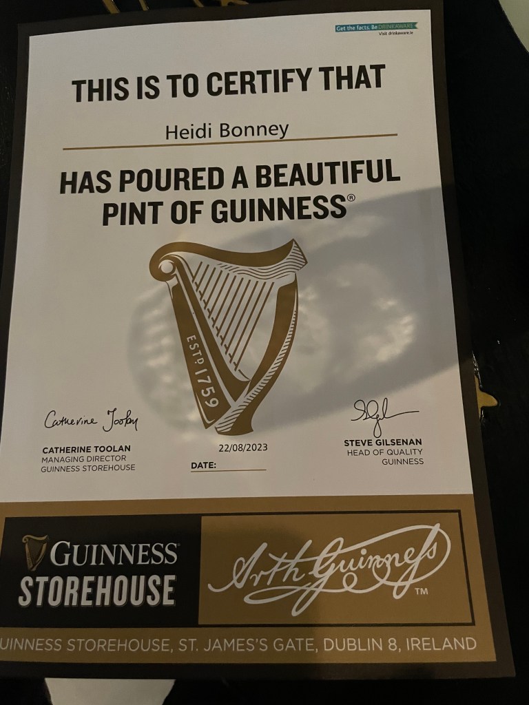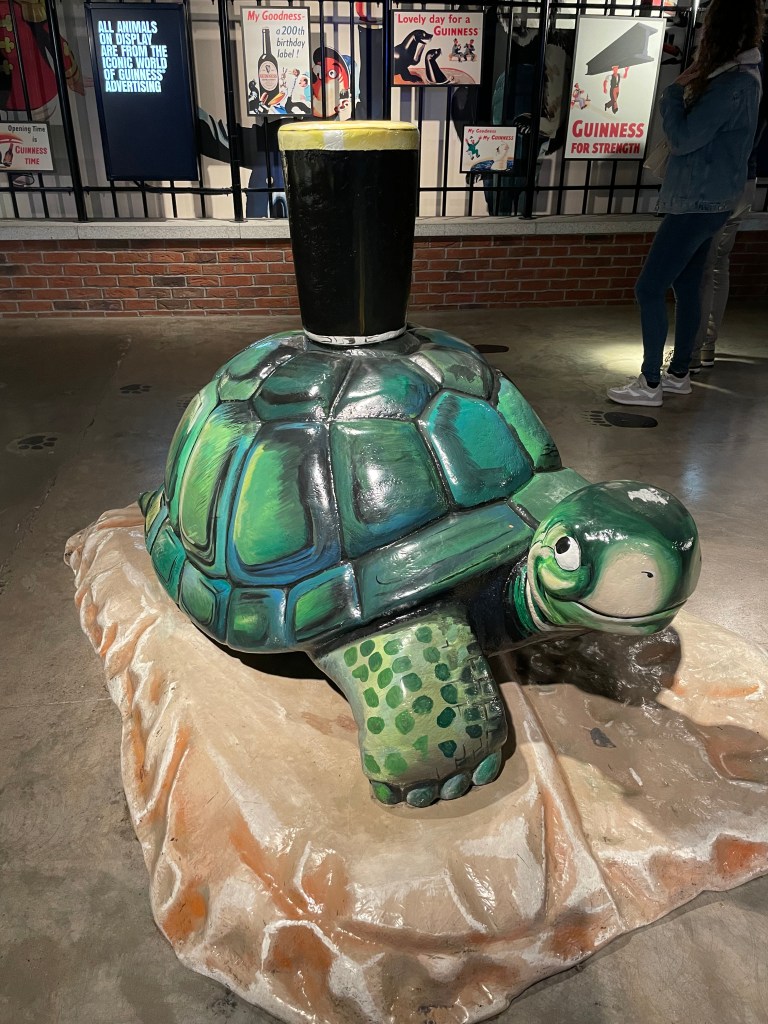 We each got a certificate for pouring a perfect pint, which I thought was a nice touch. After we drank our perfect pours, we went downstairs to the store. I really wanted a Guinness t-shirt that was not super expensive. I found one, a coaster with the turtle, and a freezer mug. It was a successful shopping trip. I’m glad that we went through the experience, but I would not do it again if I visited Dublin. I would just go to a pub and drink Guinness.