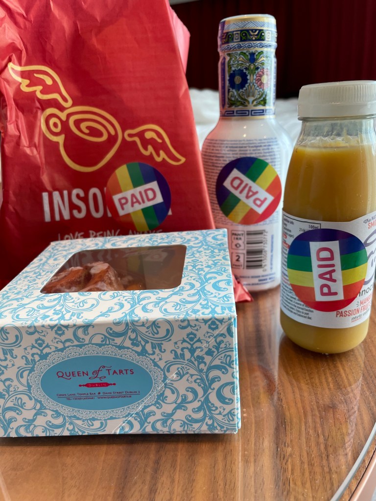 The next morning we got a cinnamon roll at the Queen of Tarts, which was still warm! It was bready and delicious. We also stopped at the Gay Spar for drinks. It has no doors, is always open, and accepts everyone. I loved the paid stickers that they used.