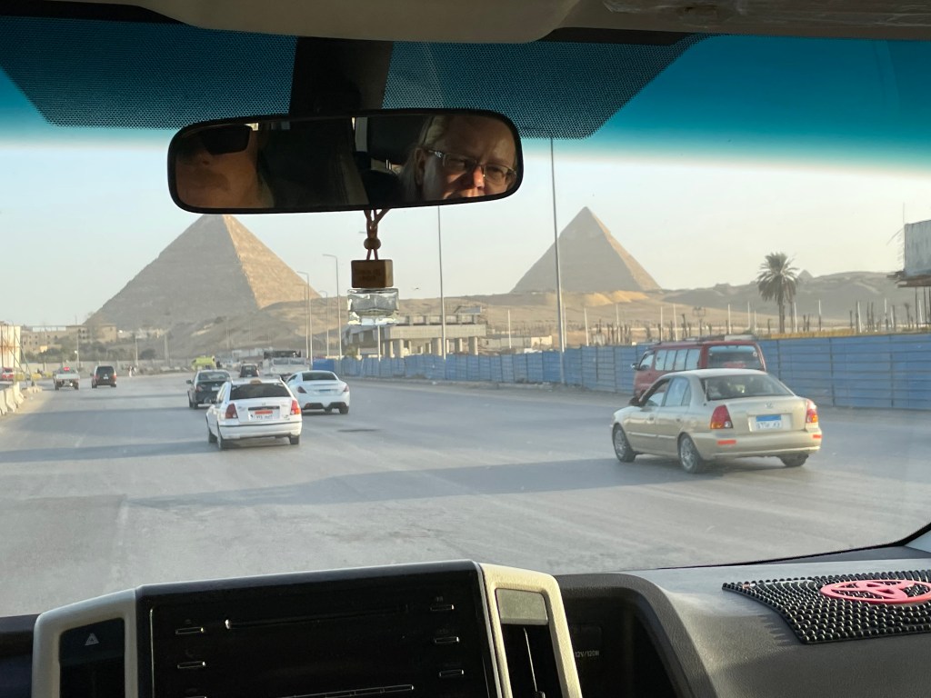 We turned a corner and saw the pyramids. It was amazing. The driver stopped (pretty much in the middle of the road) so we could take a picture from the car. Our hotel had a dog sniff the whole van before we were allowed into the gate. We checked in and found that our room had a view of one of the pyramids. How cool is that?!