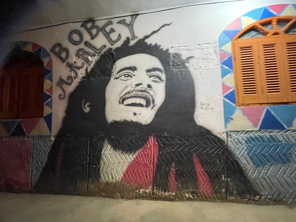 For supper, we took a boat to Elephantine Island to have a traditional Nubian dinner in a Nubian house. We first walked around the village and saw a lot of Bob Marley. The dinner started with a delicious guava juice. They offered us lentil soup, rice, eggplant, zucchini, potatoes, breaded chicken, and salad. It was quite good. We all sat around on couches, while the family was in an adjacent living room, mostly kids. The woman who made the food came to see us when she brought it in. Their cousin sat and talked to us about Nubian culture. It was very interesting to learn that their language is not written. It is only spoken and passed down through generations. In school they learn Arabic and English. Most of the kids speak Arabic and not Nubian. We had mint tea and what they called baklava for dessert. It was neat to be able to ask someone about their culture.
