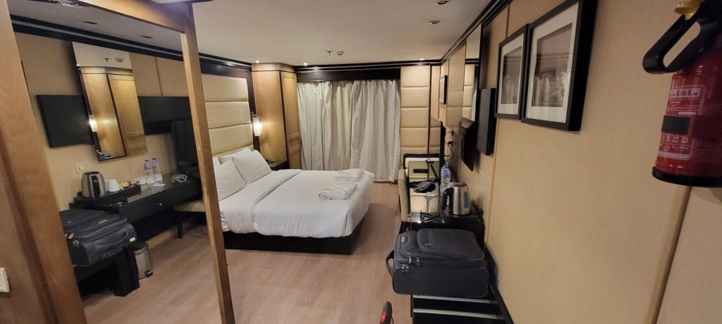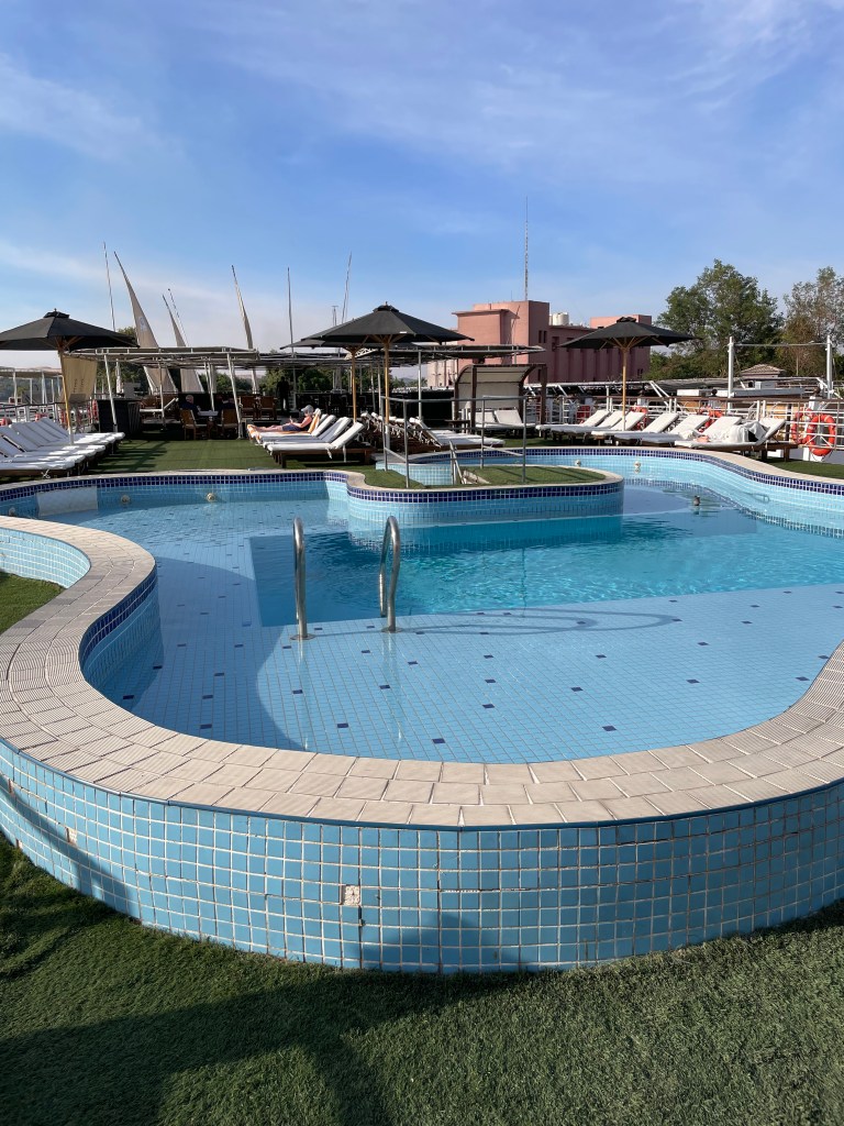 We boarded the ship to eat a buffet lunch after our visit to Abu Simbel. All the cruise ships look the same from the outside. They are docked together and you often have to walk through at least one, if not two or three, to get to yours. The insides of the ship are totally different. Ours is middle of the road. It’s not extravagant like a few we walked through, but it’s not terrible. The bottom floor is the dining room. The second floor is the lobby. The third floor has rooms and two shops. The four floor has rooms, two stationary bikes and two treadmills, a lounge/bar and seating on the back outside. The top level has a pool and another bar.