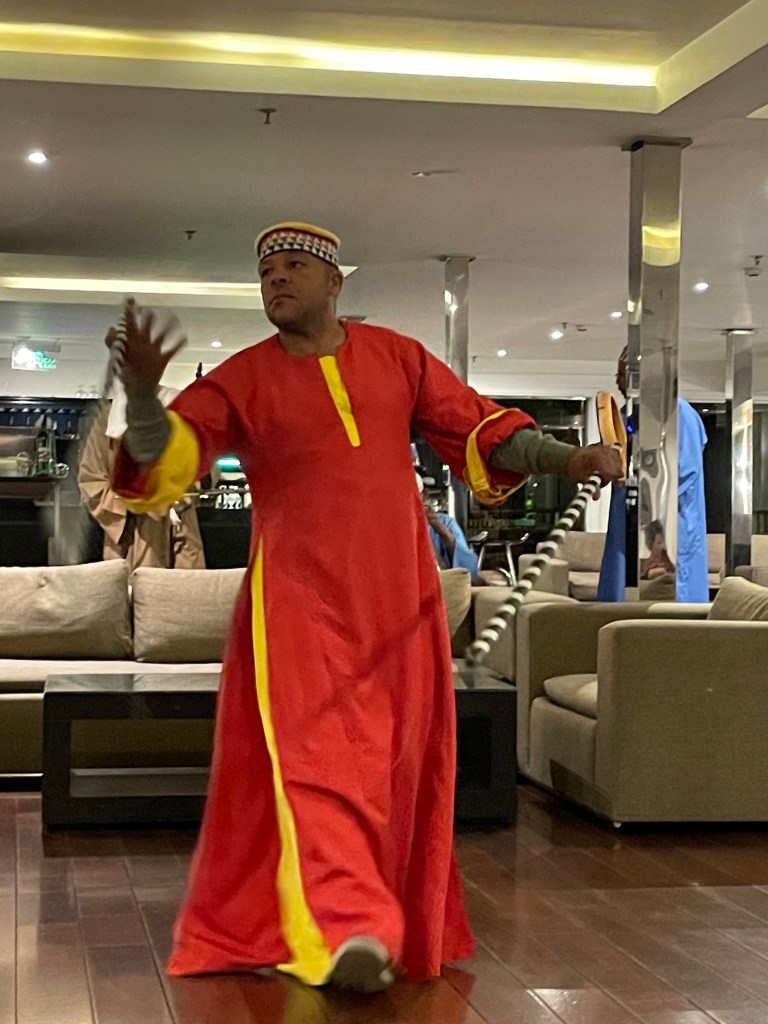After our sunset sail, we boarded the boat and had a buffet dinner. That night they had Nubian dancer perform in the lounge. Of course, Jef had to sit right in the front, so after two dances, one of the guys grabbed my hands and pulled me up to dance. They pulled up most of the room. Even though I was pretty tired, it was very fun. The last guy they had pulled people up and was speaking gibberish to them and asking them to repeat it. It was very funny. Of course he took the most reticent of our group members up to do it. The other people had a Spanish accent to their gibberish.