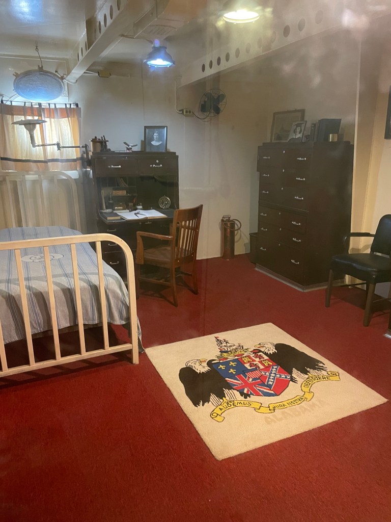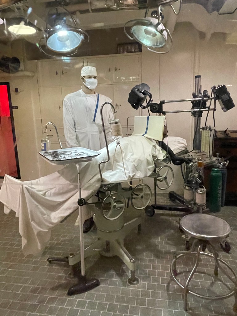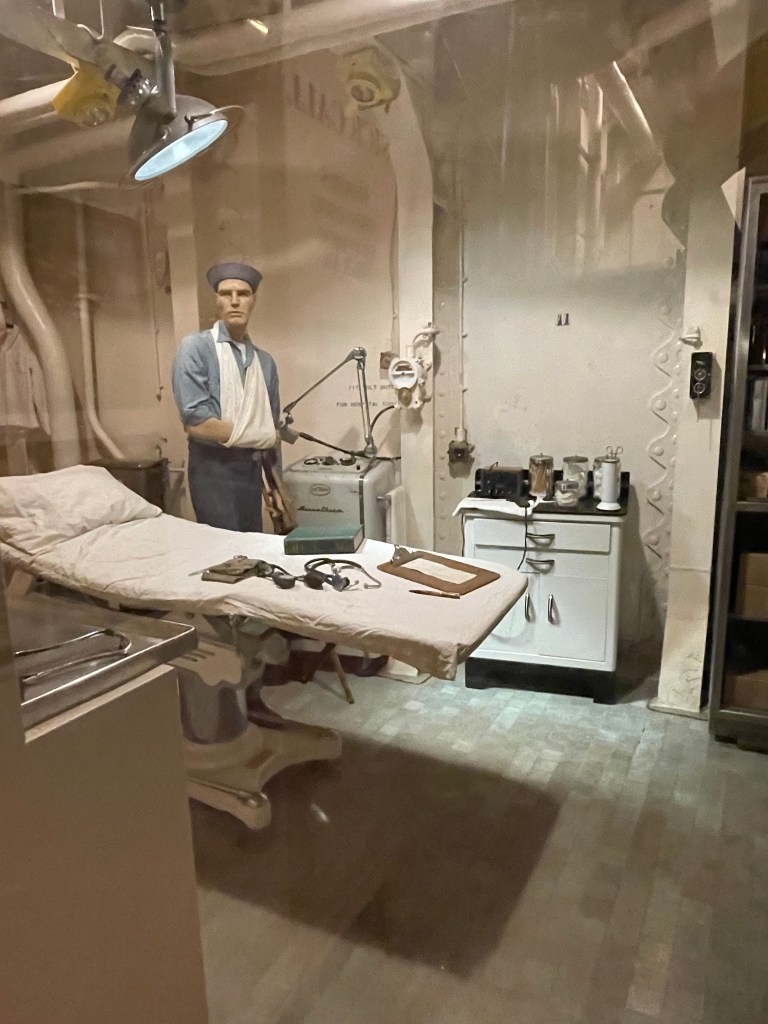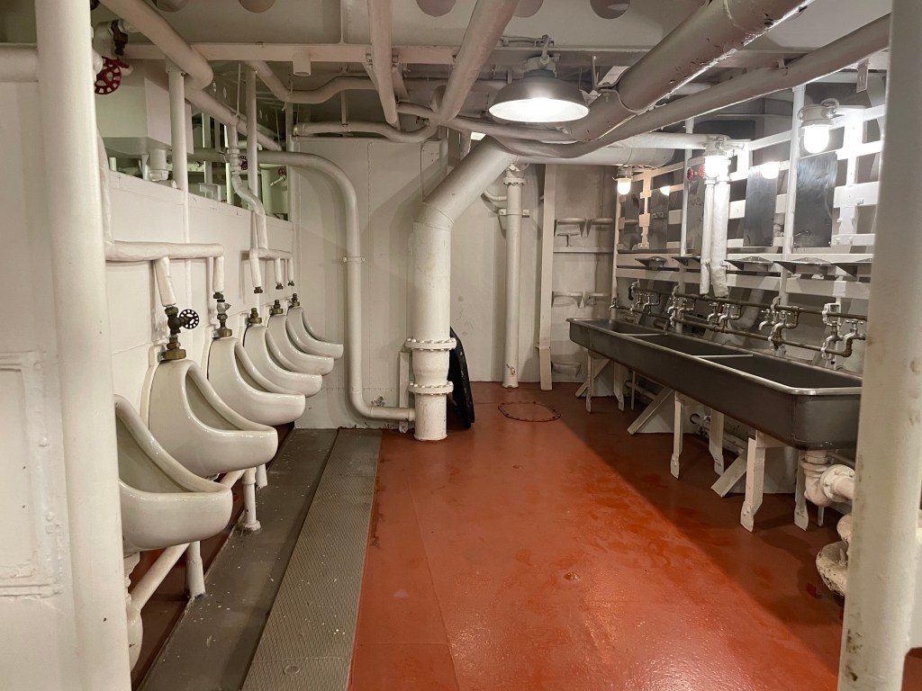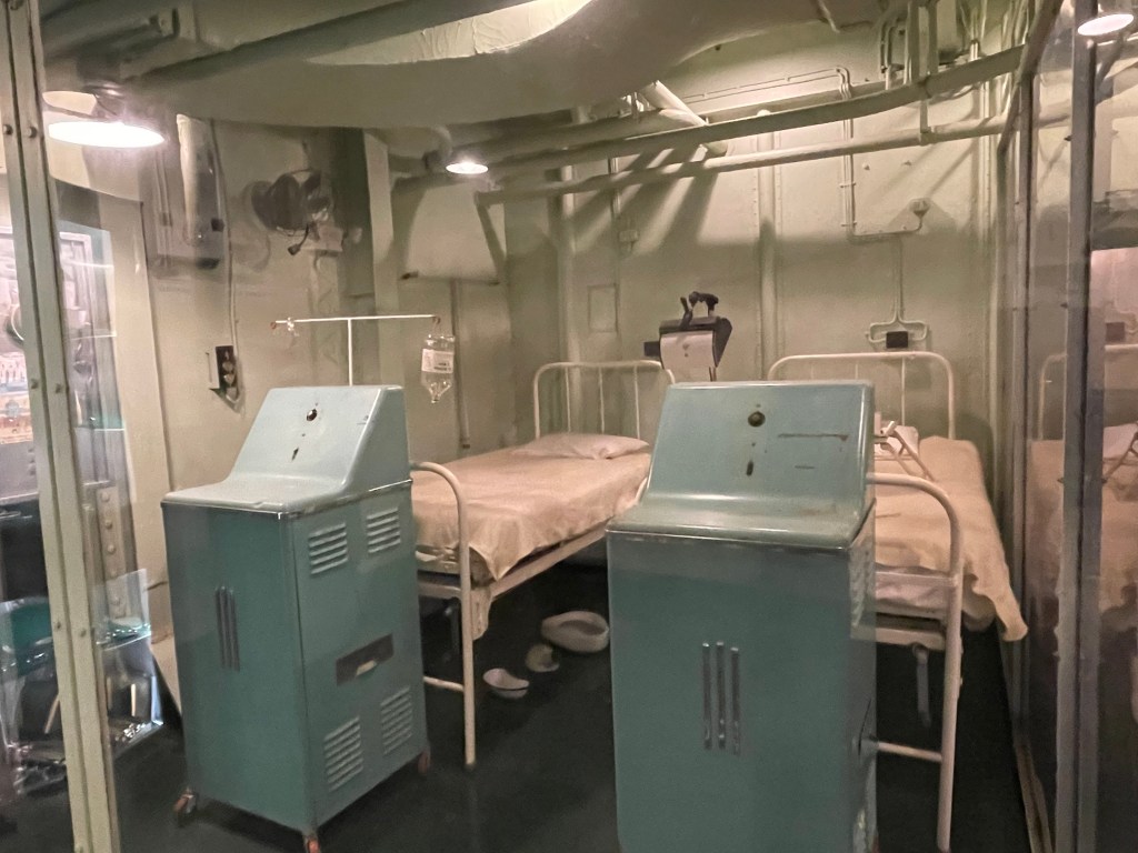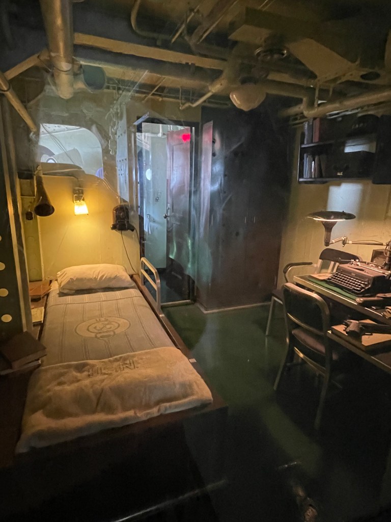 I really enjoyed exploring the ship, but it was important that we followed the self guided tours. We saw quite a few people just wandering aimlessly throughout the ship, going up down areas and just skipping all around. It was really easy to get lost. If you go into the Tour Entrance on the main floor, they will explain to you the three different tours. One is yellow, one is red, and one is green and even though there are arrows and numbers for each place, it’s also good to pick up a paper that highlights the directions so you make sure you are in the right place and not missing anything. It says each tour takes about 30 minutes, but some took us longer because we read all the placards. Also, you need to be able to climb up and down a good number of stairs that are quite steep, so be prepared. Obviously you don’t have to do everything, but I really enjoyed seeing it all. It was amazing to see all the things that they needed to have for the crew. I didn’t take pictures of everything, so you won’t see the shoe shop, laundry room, photography lab, or all the different areas for all the different kinds of officers, but I think these pictures show a lot.