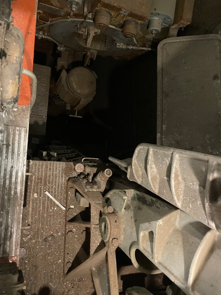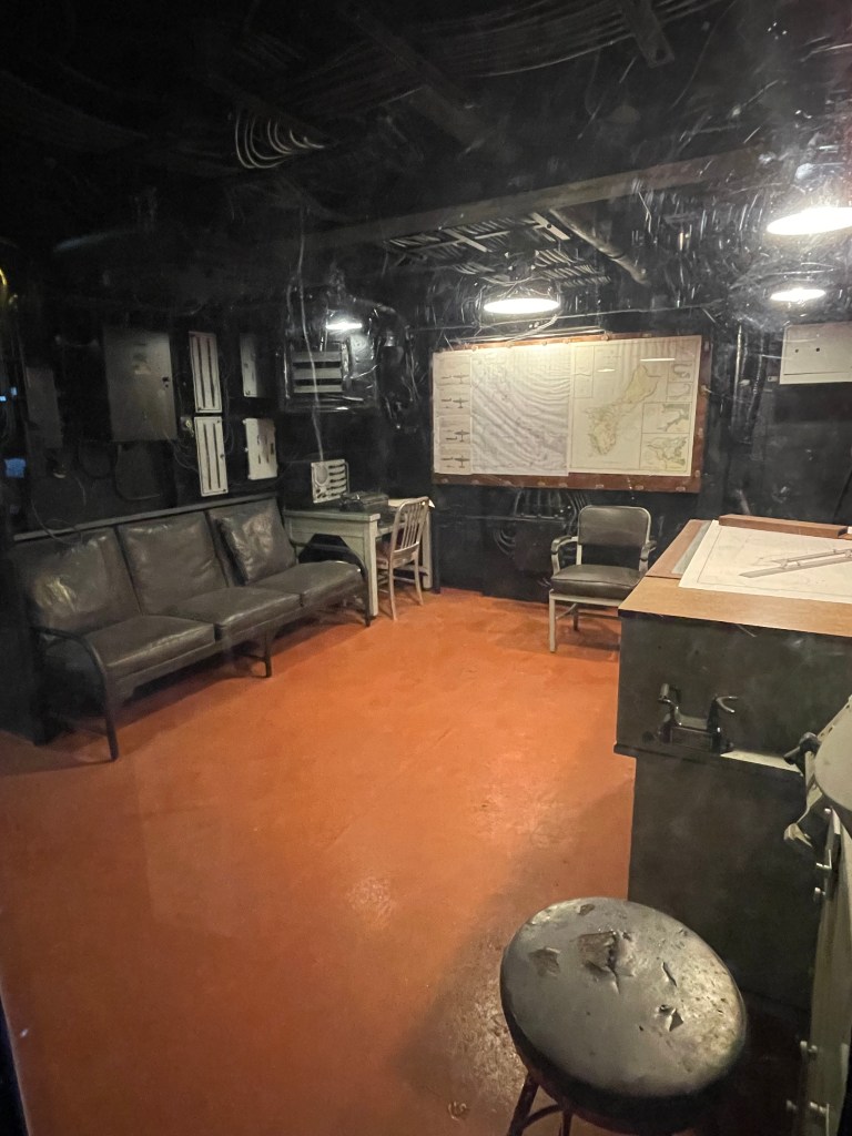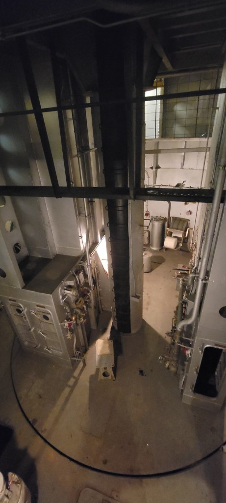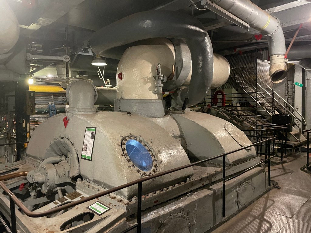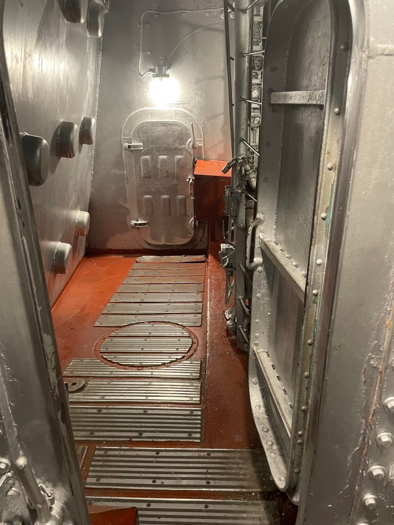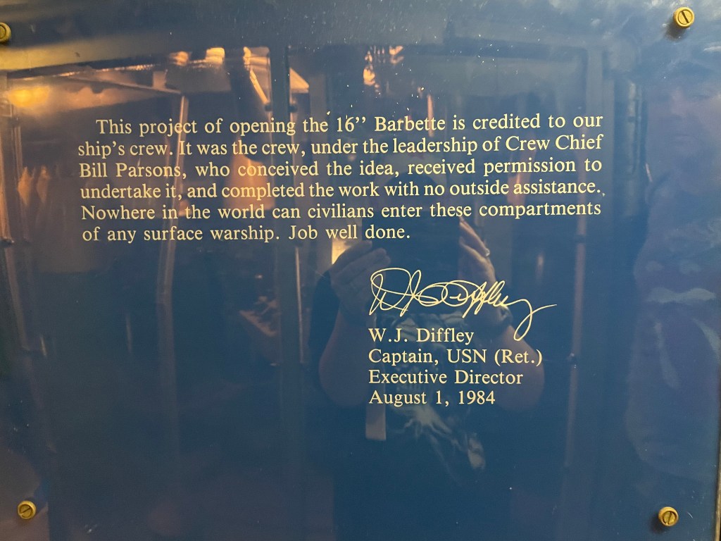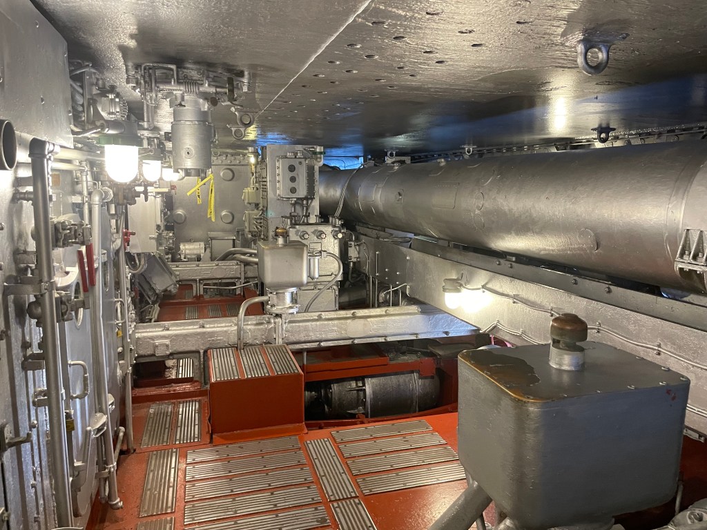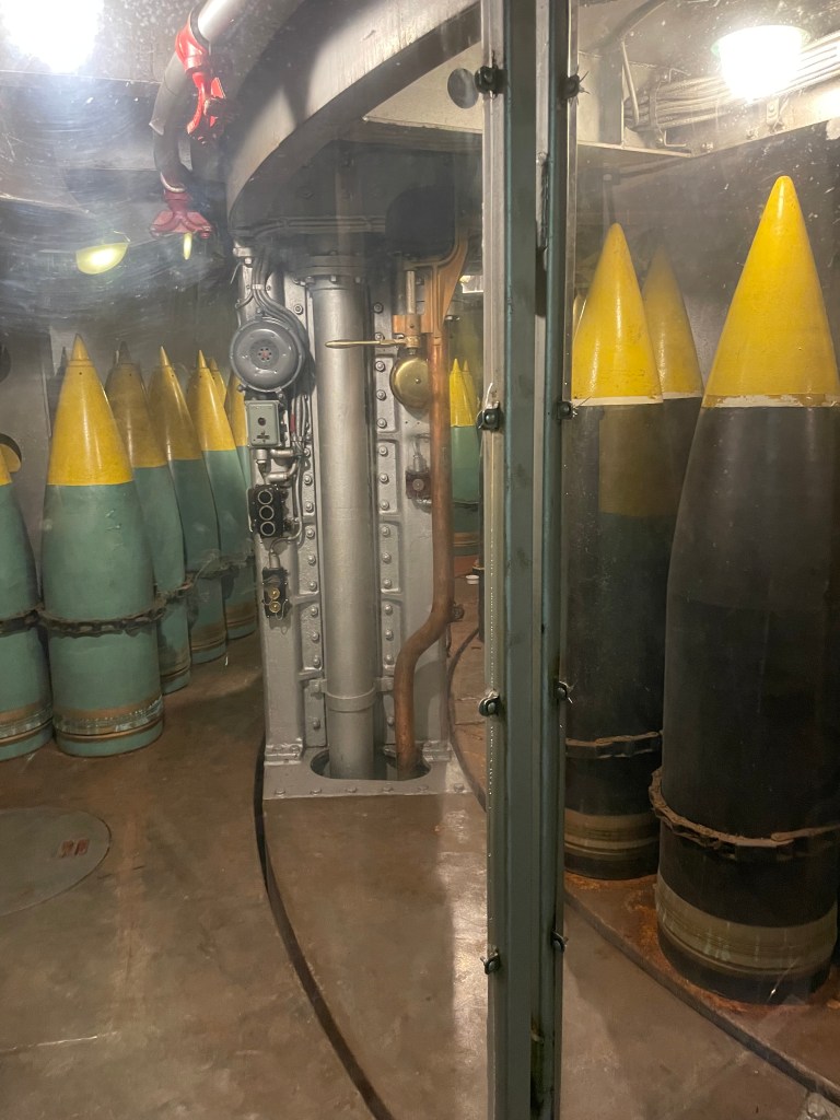 When we first got on the ship, we wandered around the top deck. We saw a couple come out from inside one of the gun turrets, so we scurried up inside too. It was a tiny space. My husband is 6’2 and his head was skimming the ceiling. There were spaces that he could not access, so I went in and took pictures. Sometimes it’s good to be short!