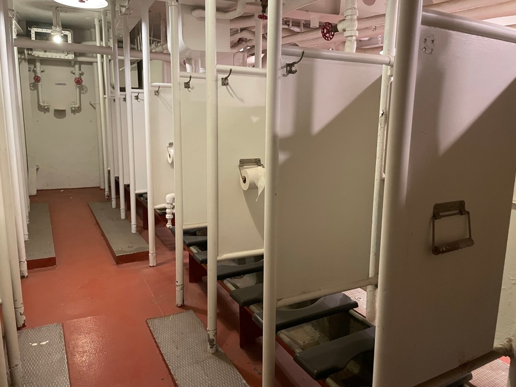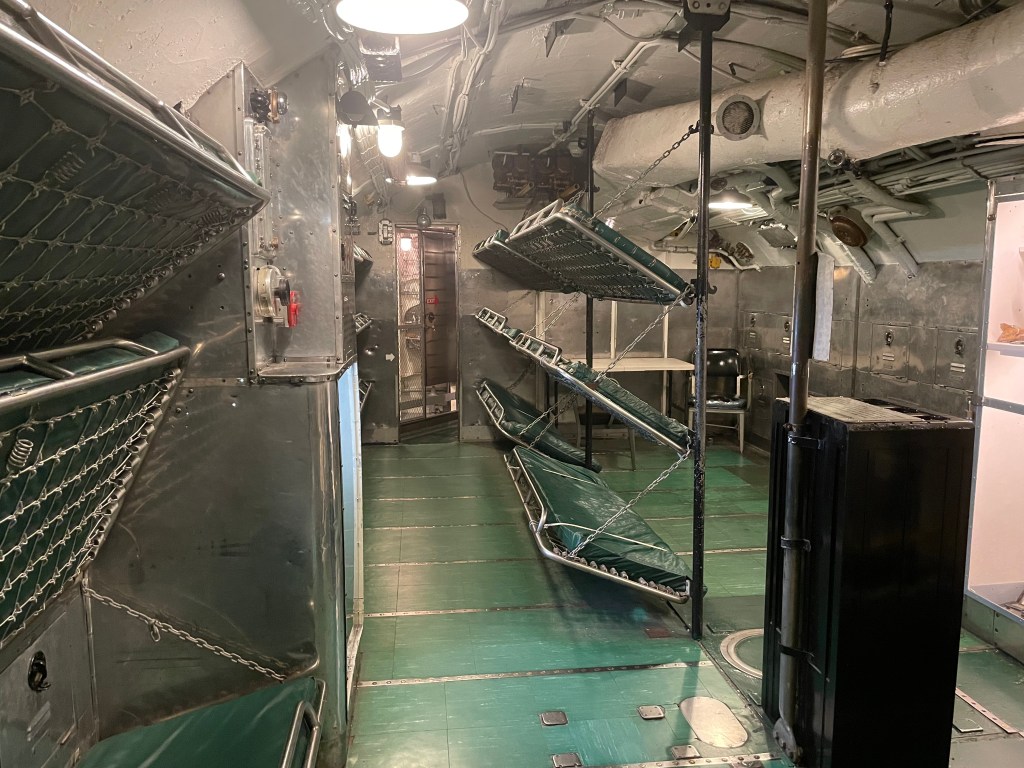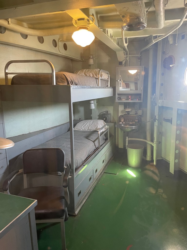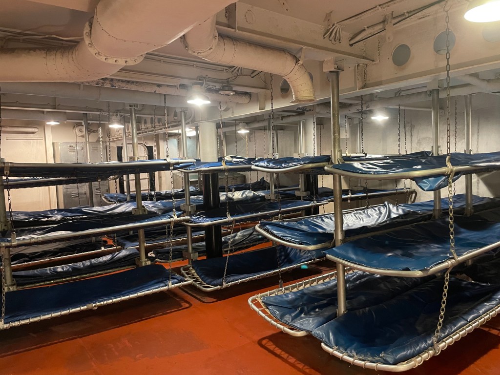 My uncle was in the Navy, but on a smaller boat. He said their bunks were five high. If one person rolled over, all the others felt it. He said there was a section where they could climb down if they got up in the middle of the night. I didn’t see that here.