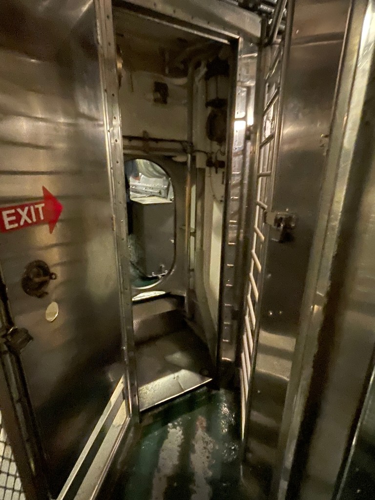 This tiny area has the toilet on the left and the shower on the right. However, the men did not use the shower when they were under water. They used the condensation from the ship to wipe up. Sometimes they would surface in the rain and go topside to clean up. The one thing I didn’t think about was that it was very hot and humid inside the submarine.