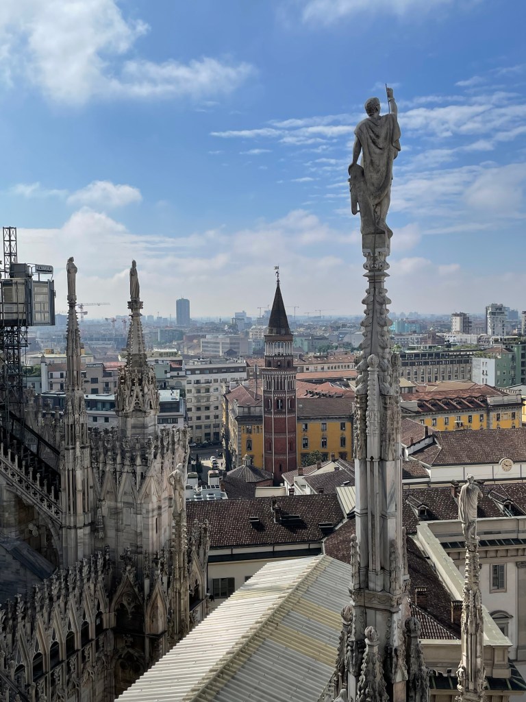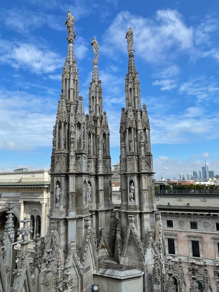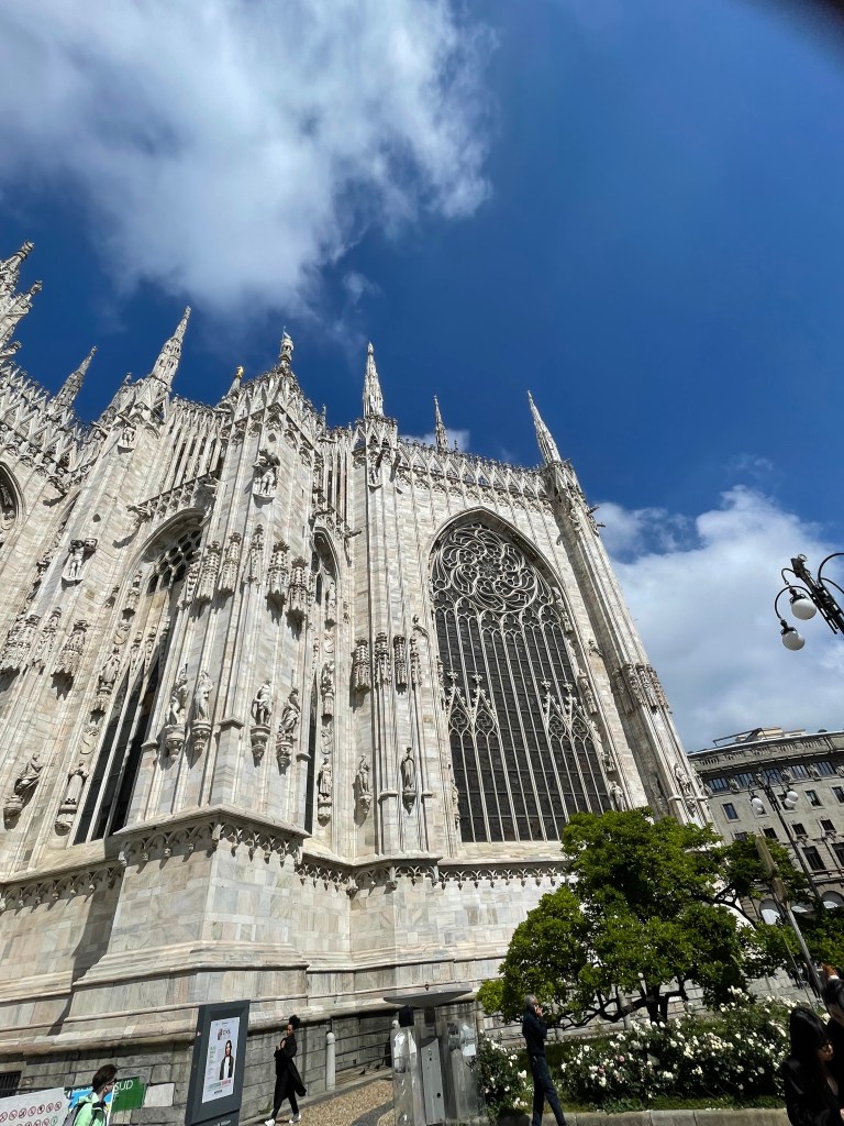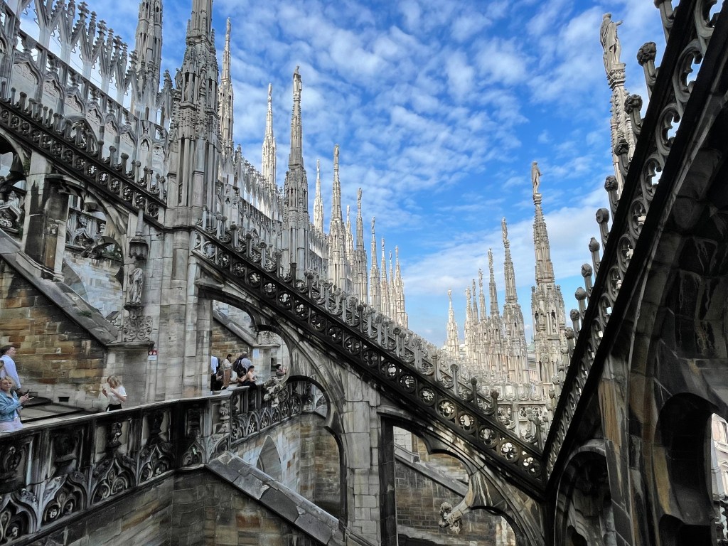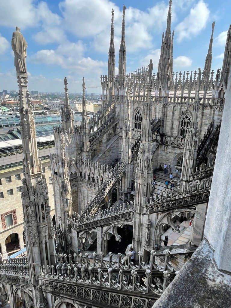 We arrived in Milan early on a Wednesday morning. We couldn’t get into our hotel room until much later, so with little to no sleep the night before, we stored our luggage and headed out into the city. The hotel was very close to the Duomo di MIlano (Cathedral of Milan) so we thought we should check it out. My husband bought tickets online for us to go up to the terraces. They were around 20 euro each. Even though our online ticket said 11:30, the guy at the gate let us go up as soon as we bought them, around 10:30. There was no one in line at the time.