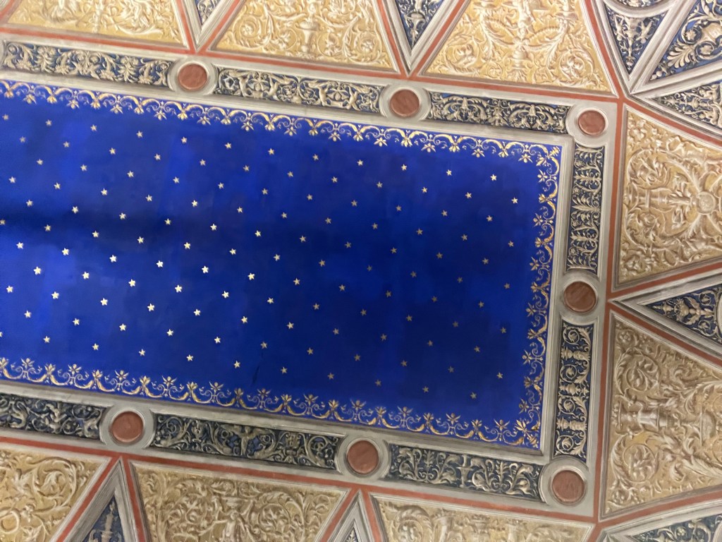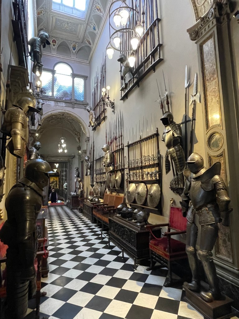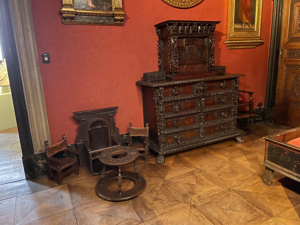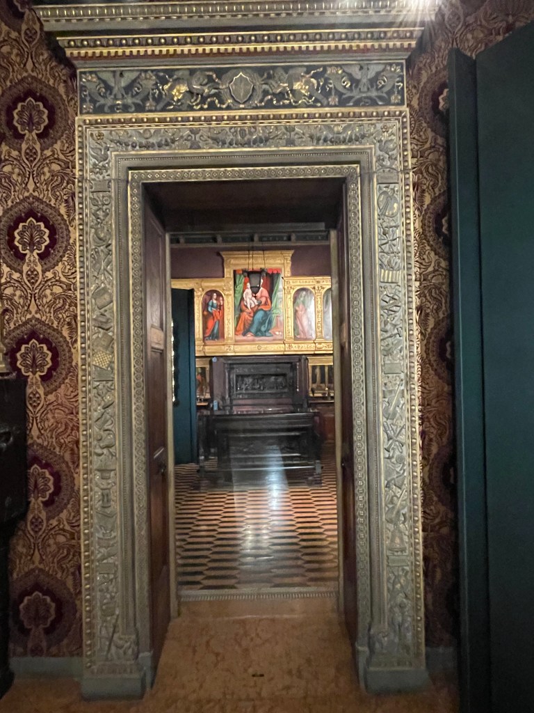 We also visited a home right in the middle of the fashion district. It is called the Bugatti Valsecchi Museum which was the home of two brothers who collected Renaissance era furniture and art. The home was built in the 1700s and the family was famous nobility until the 1900s. This home was definitely more of a museum. I loved the ceilings, the intricate carved doorframes, and incredible wooden furniture. My husband’s favorite was the hall of arms. He thinks we need one in our home now.