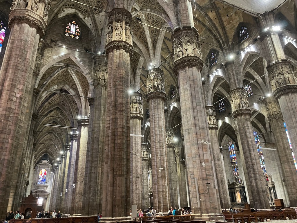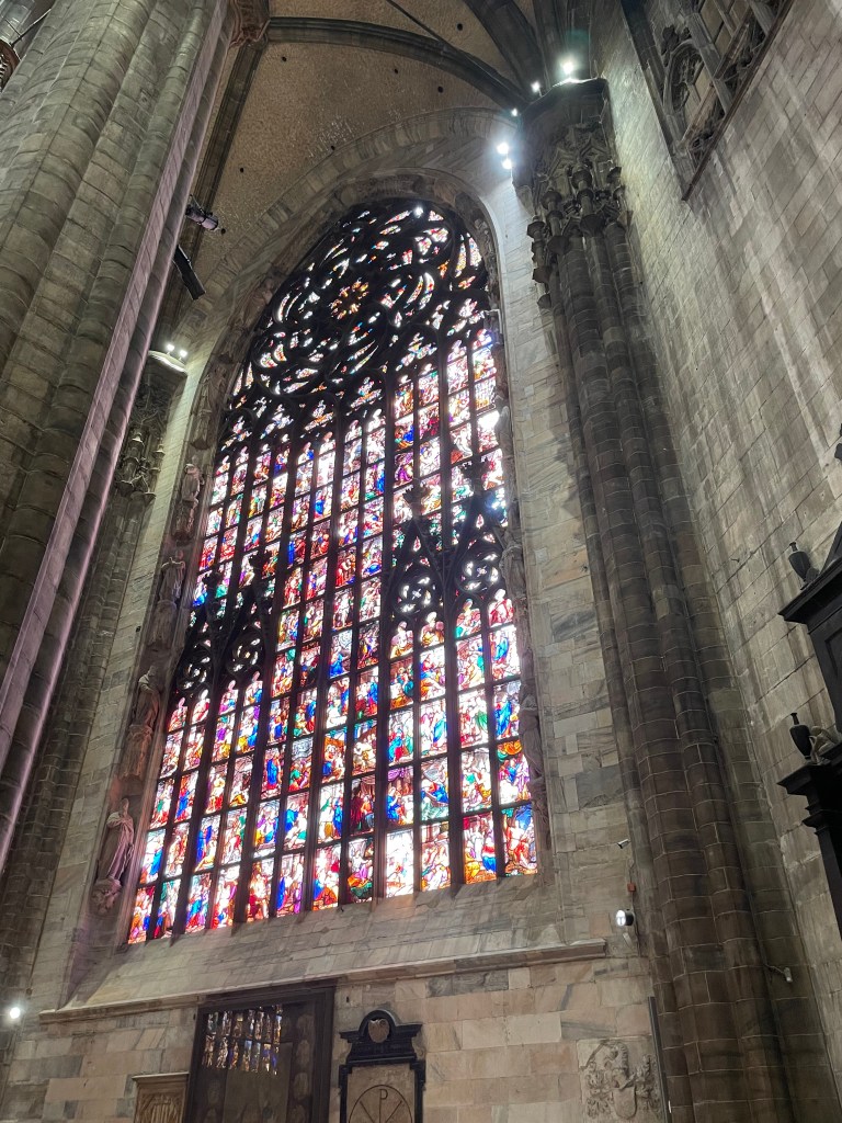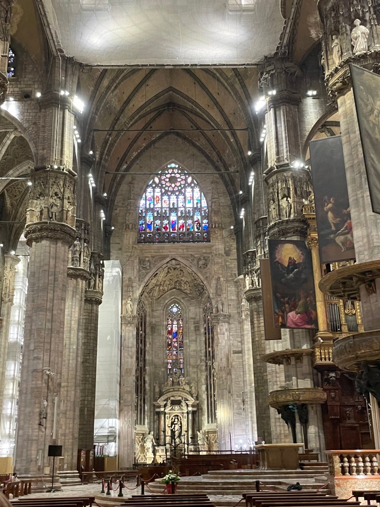 The stairs down put you into the Cathedral itself. You have to show someone your ticket if you want to wander around inside. The sheer size of the space makes you feel minuscule. The columns are massive. The Duomo di MIlano is the third largest cathedral in the world. It also claims to have one of the nails of the cross that held Jesus. Apparently it looks nothing like a nail, but they house it in one of the lanterns that are near the altar. Therefore you can tell everyone that you saw if, without really seeing it.