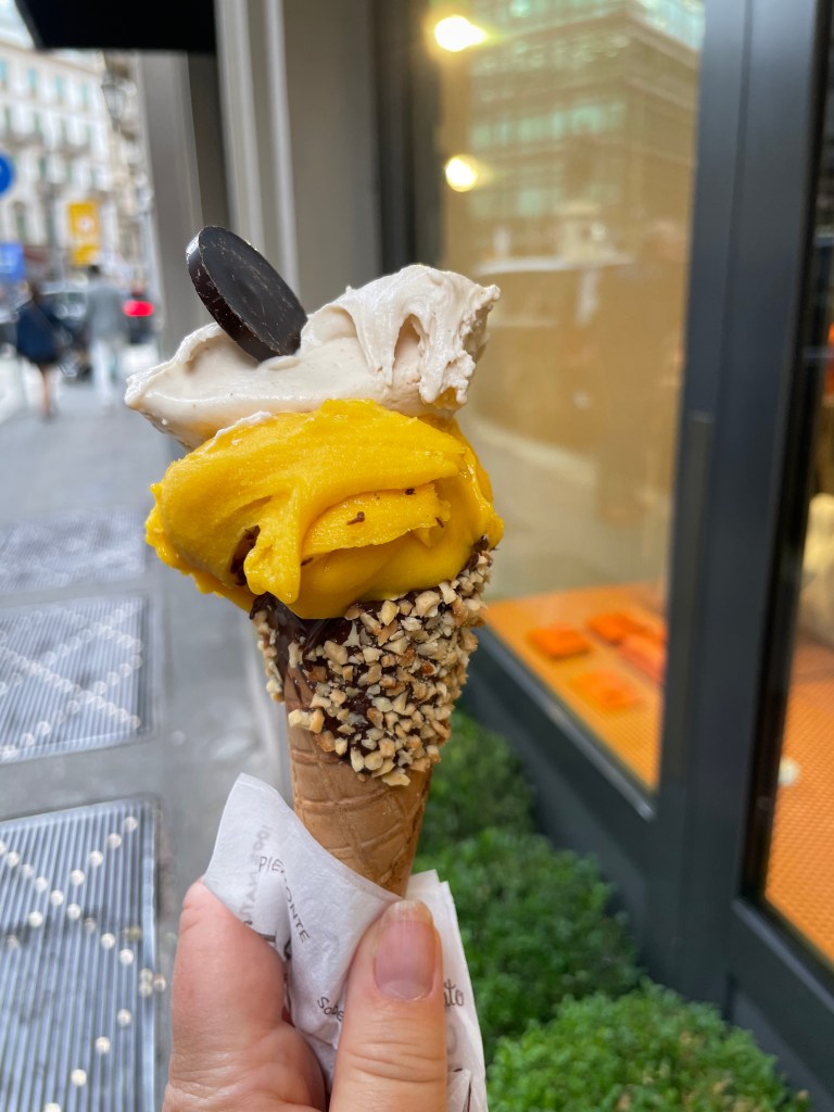 Before we headed out to dinner, we walked through the fashion district. We went into a few stores. In the Gucci store, they have someone follow you the entire time. It’s helpful if you see something you like and have questions because they are not intrusive. In the Louis Vuitton store however, I tried to look a purse and got yelled at for touching it. I was not the only person this happened to while we were there. It did not make me want to buy anything. We headed out to dinner for some fresh pasta and on the way back to hotel I stopped for a gelato.