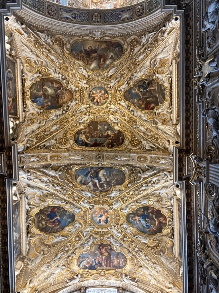 We checked out several churches. The first was a private chapel, so we were not allowed to take pictures inside, but this was the outside. We also paid to enter the basilica and the ceilings alone were worth the price of admission. There were actual sculptures up there! We went into the crypt area and the tombs were in a semicircle. As I started reading the dates I realized that they were all quite young, some as young as 9 and not all the tombs were filled. I have looked online but cannot find an explanation for why there were tombs of children in the crypt instead of members of the clergy.