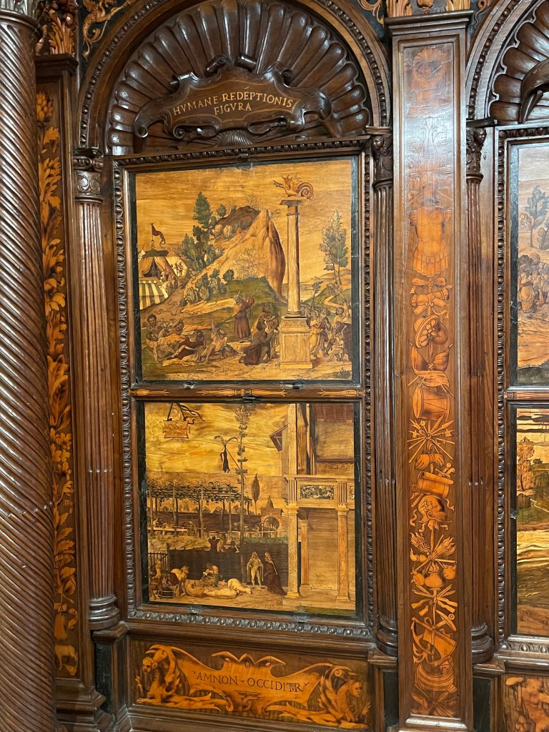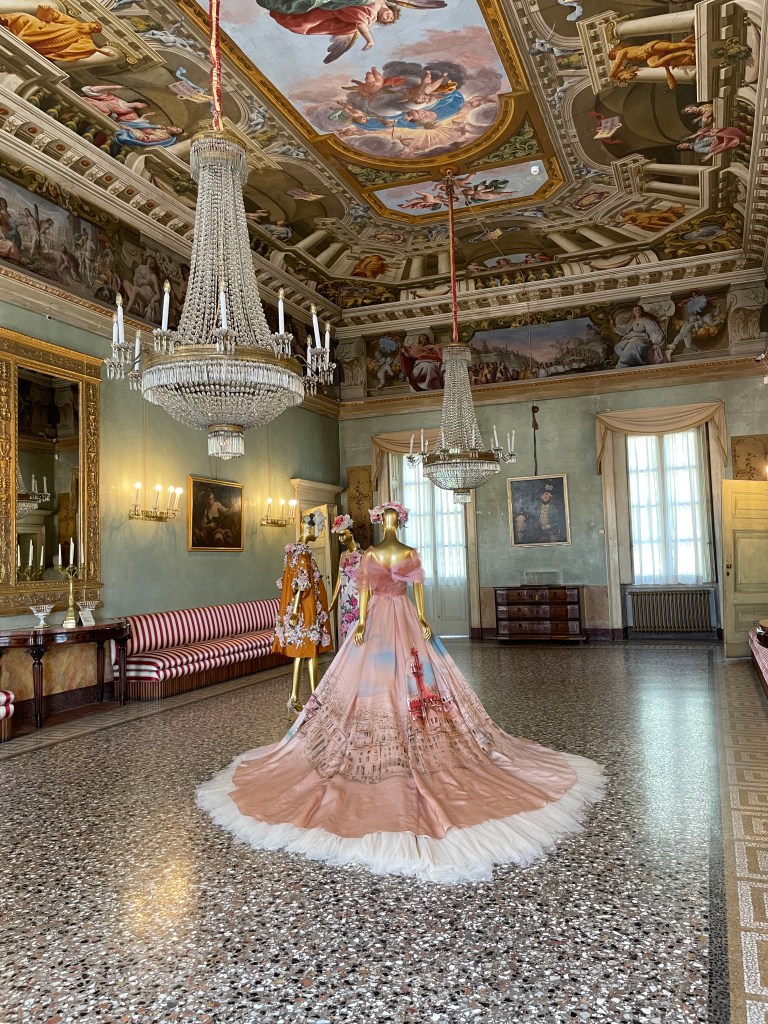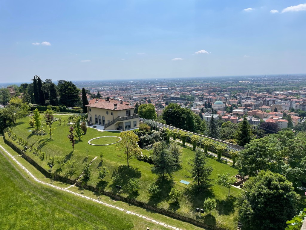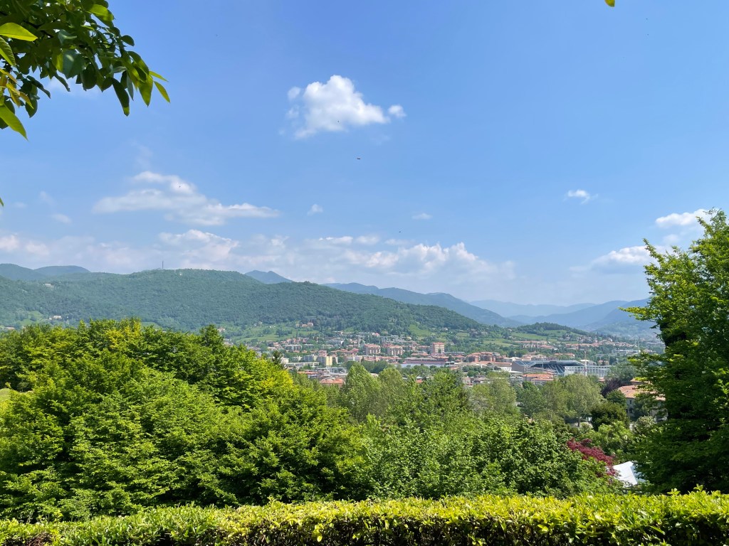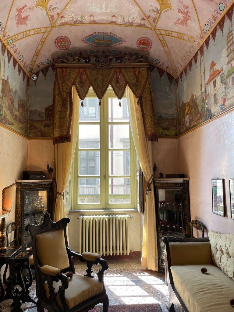 We wandered through the pedestrian streets (until a car came through per usual in Italy) and made our way to the Palazzo de la Ragione. It was supposed to open at 11, but the gate was padlocked. My husband checked the google reviews and found that it had several that said it was the time it should be open and it wasn’t. We decided to try another Palazzo and visited Palazzo e Giardini e Moroni. There was some kind of silk exhibition that day so instead of charging us 11 euros to enter, we had to pay 14. The silk exhibition included stalls of people selling silk and some silk handing from the entrance. It was not very exciting. The Palazzo had amazing ceiling frescos. The rooms were not as impressive as others we have seen, but I enjoyed the Chinese themed room. The gardens were also lovely and we had a great view of the mountains and lower town.