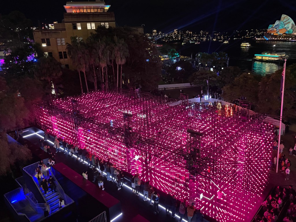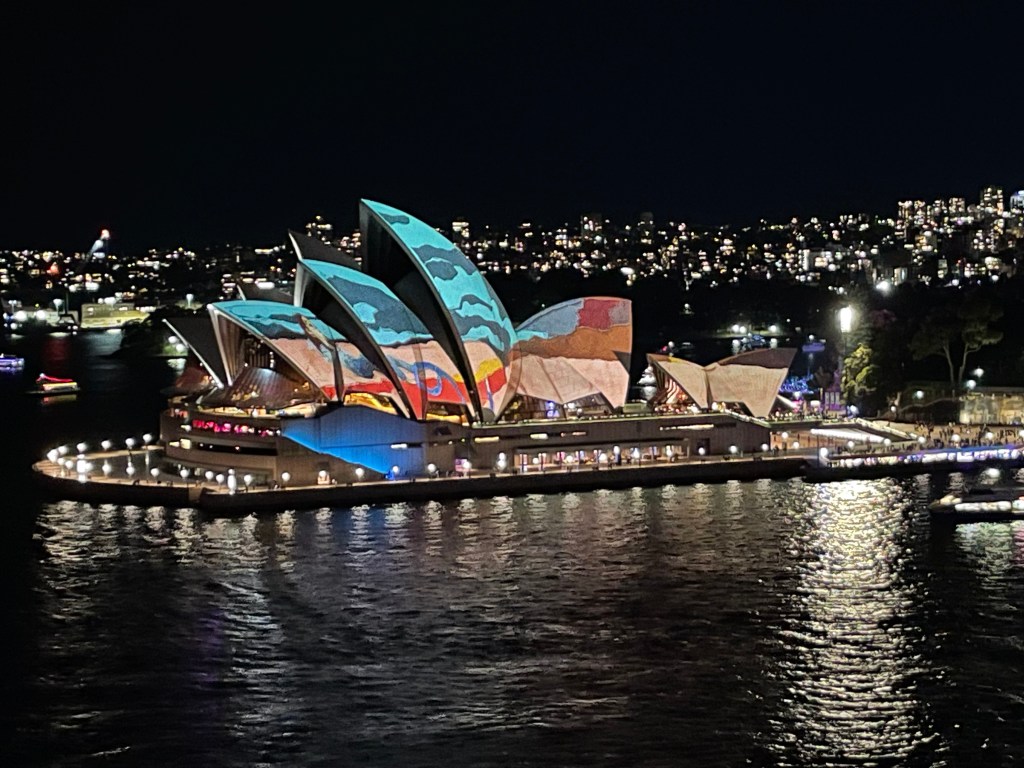 We were not aware that Vivid was taking place in Sydney while we were here until my friend mentioned it was happening. We had some dinner out and then found a spot to watch the light show on the sails of Sydney Opera House. It was a complete story. There were also lights from surrounding buildings. They have a whole map of things you can go and see. We did half of the light walk. I love the church and the show that was on the Commerce Building. It was weird and that’s why I liked it so much.