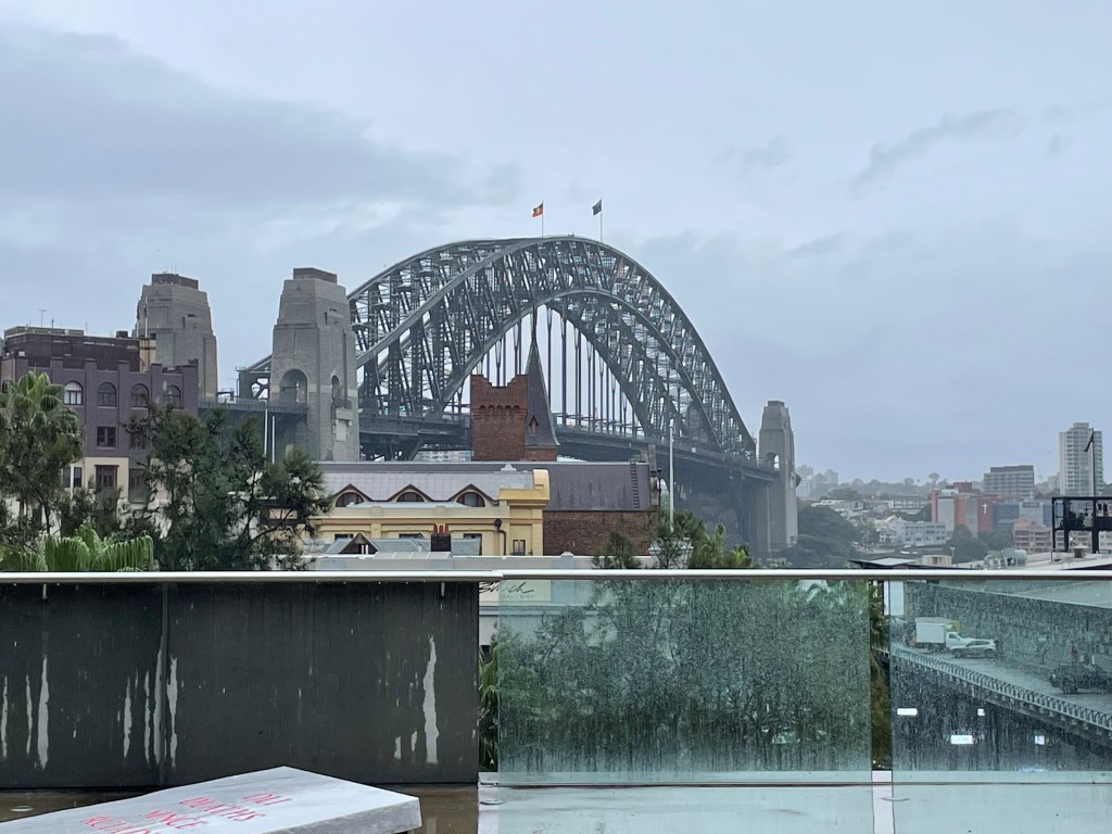 We ended up at the Museum of Contemporary Art. My friends were not interested in the exhibitions, so my husband and I walked through rather quickly. There was a nice display of aboriginal art, but there wasn’t much else that interested us there. We met up with our friends rather quickly. The view from the rooftop cafe was impressive, even in all the rain.