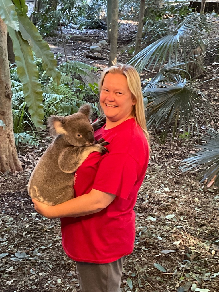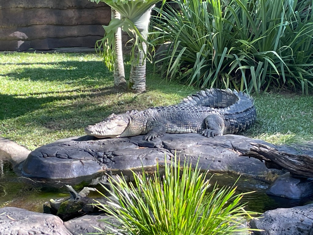 We found the tree kangaroo really high up in the branches of his tree and headed toward the koala encounter. On the way, we saw some lizards, dingos, and crocodiles. You stand in line to hold the koala and they take your picture and give it to you as part of the cost. You can take pictures with your cell phone as well, which we did. The keeper who handed us the koala (I think his name was Conley) chatted with us more than other people. I think she could tell this was more about interacting with the koala than the picture they took. My husband went first and Conoey pointed his little nose up to sniff him. Adorable. They are so soft, but you hold them gently on the butt and don’t move because they will think you are a tree and have to clutch onto you. Their claws are sharp! When I held him, he was looking over at some noise on the other side and they had to lure him to look at the camera with some leaves. After you hold him, you can pat his back. We loved every minute of it.