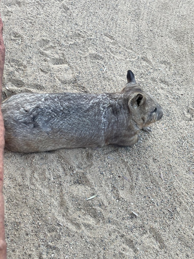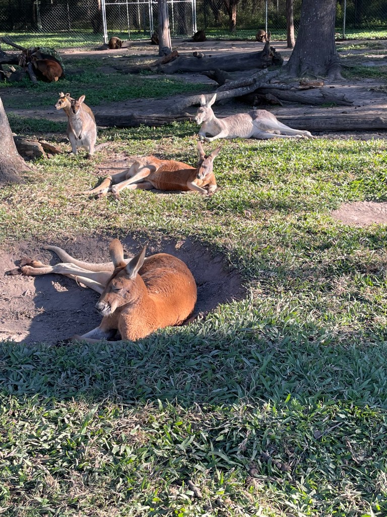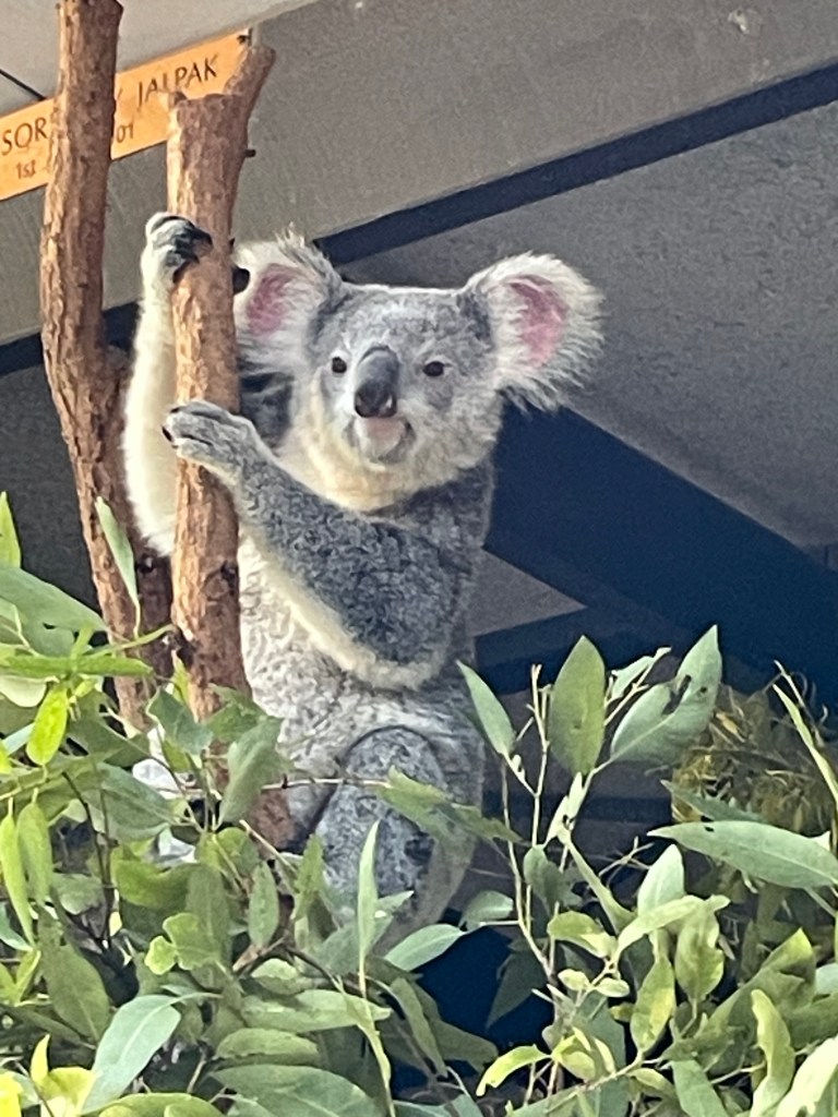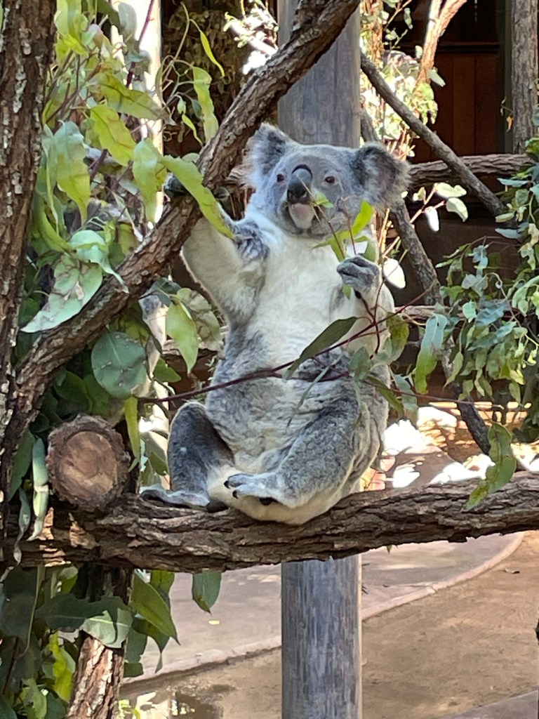 Of course, because it is a koala sanctuary,, there are a TON of koalas. They are all so fun to watch. Many are sleeping, since that is what they do for 22 hours of the day. However, there was one that climbed down his “tree” and then sat and looked at us for a bit before running over to another tree to climb. Others are quite involved in eating and it’s fun to watch them navigate the branches of leaves.