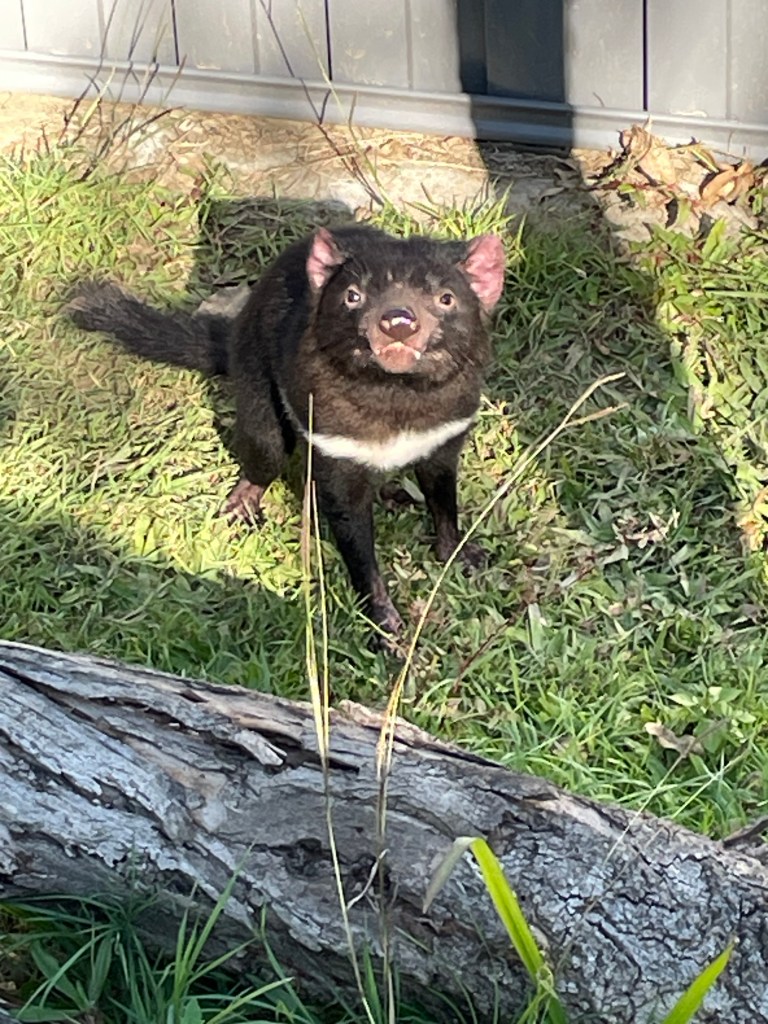 We visited Lone Pine Koala Sanctuary after procuring a koala cuddle online for 2:45. It’s a good thing we did! They were pretty much sold out when we arrived around 1pm. We started our visit by going left over to the nocturnal animals and the barn. We quickly bypassed the sheep, goats, chickens, and pigs. My husband had to stop and try to make friends with the tiny donkeys. (They were not interested.) The nocturnal animal section has three gates to go through. They close at 4pm, even though the park is open until 5pm. You can see a lot of the enclosures since you are walking above ground on grated metal. We did not see any of the tiny nocturnal animals, but we did see two wombats. We also were lucky enough to watch the keeper feed the Tasmanian Devils. I actually helped her find one of them because she needs to throw the food (wrapped in paper bags) in two directions. She fed another Devil with a box, which he promptly picked up with his mouth and carried off. It was so cute.