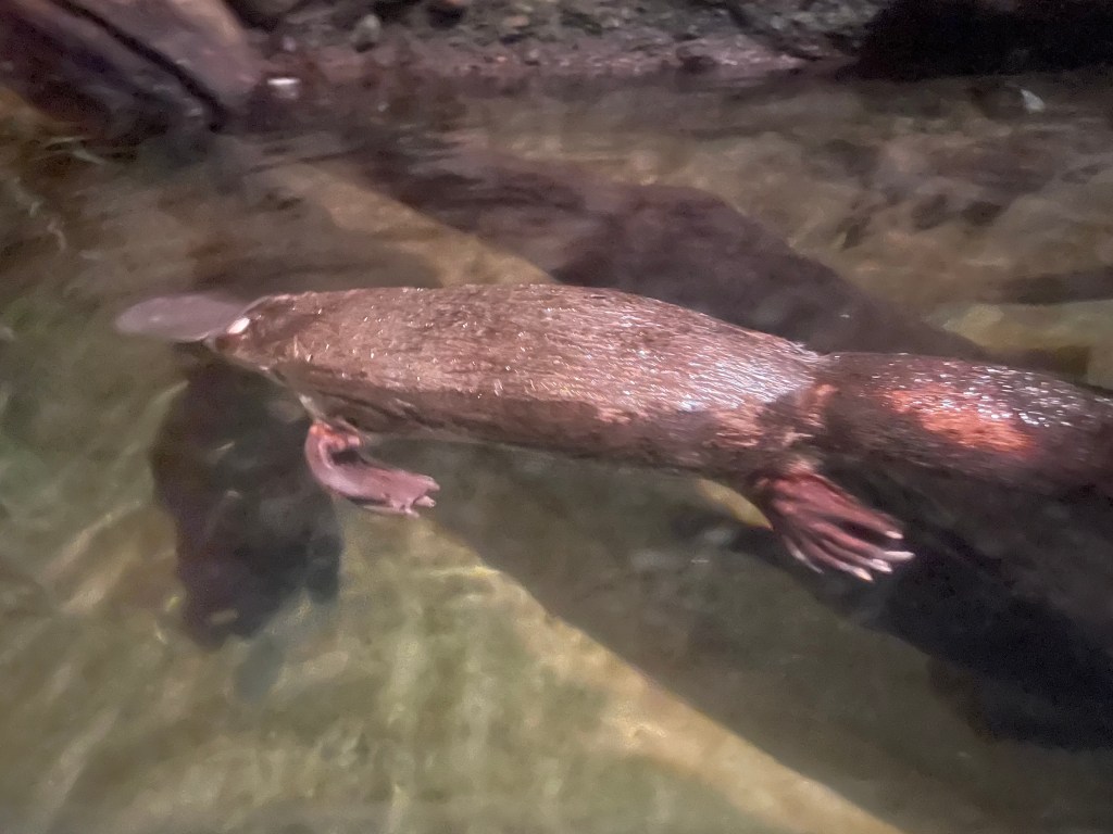 The other exciting part of our visit was getting to see two live platypuses! I have always wanted to see one, but it’s very difficult to do so in the wild. The room was quite dark where they were kept. We watched them find the crayfish (through electrolocation) and then dive to bring them back to the surface and eat them. You can tell they can’t see too well. It was so cool to just sit and watch them.