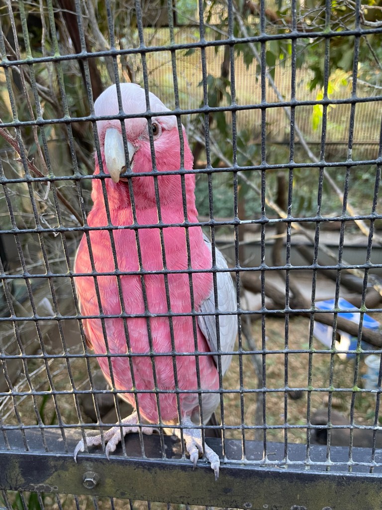 I found a friend in the aviary area. This adorable galah or pink and gray cockatoo climbed up their cage and stayed there to talk to me and pose for pictures. I wanted to take it home with me.