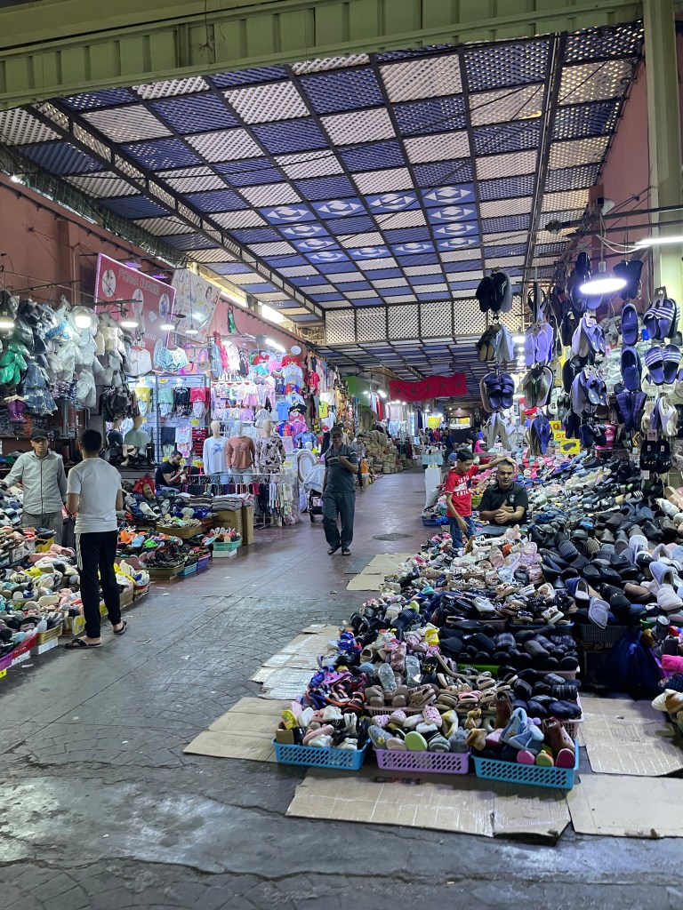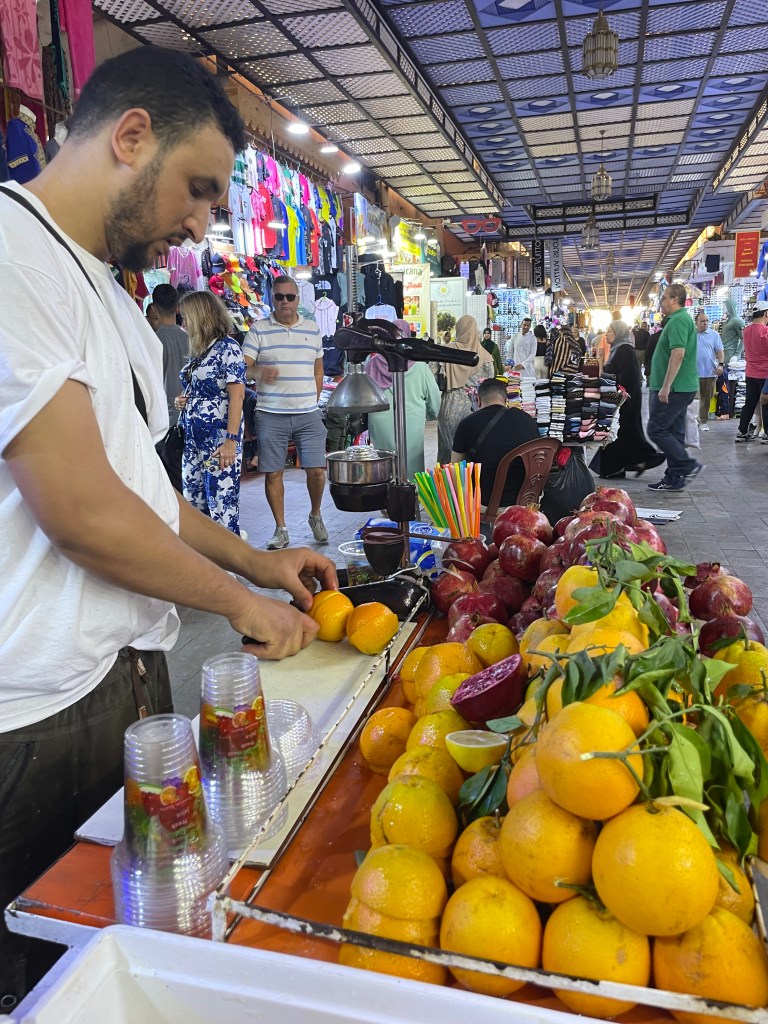 After the Medina, we went to the Souk El Had market. This was really cool. There were stands as far as your eye could see. There were fruit stands, clothing, household items, spices, furniture, rugs, eyeglasses, food, handmade items, and really anything else you could imagine. We stopped and bought a fresh squeezed (right in front of us) orange juice. It was delicious. My husband stopped to buy a single banana and the vendor gave it to him for free. The vendors did ask you to come and look at their wares, but they were not overly aggressive about it (like we witnessed in Egypt). It was a really cool place to see.