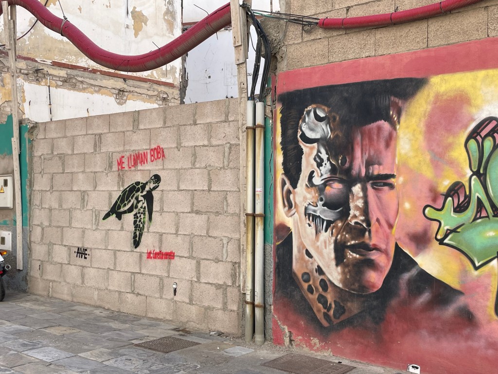 We didn’t get off the ship until about 10. We decided to walk the mile or so over to one side of town to see a few things first and take a taxi later in the day. It was in the low 70s, but there was a bit of humidity. First we checked out a market that was just opening near the port area, then we walked over to the beach. Everyone seemed to be in that area. We walked along a pedestrian walkway and enjoyed the ocean breeze and views of the water. We found a cool mural of the Terminator on our way to see the castle we walked down some colorful stairs. We stopped briefly in a convenience store for some juice and bananas for a snack. The castle is located in a beautiful park. It has been converted into a modern art museum. We are not huge fans of modern art, so we took a taxi over to the other side of town.