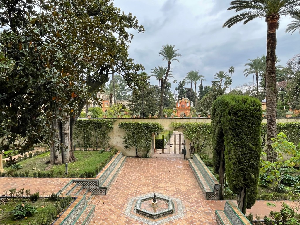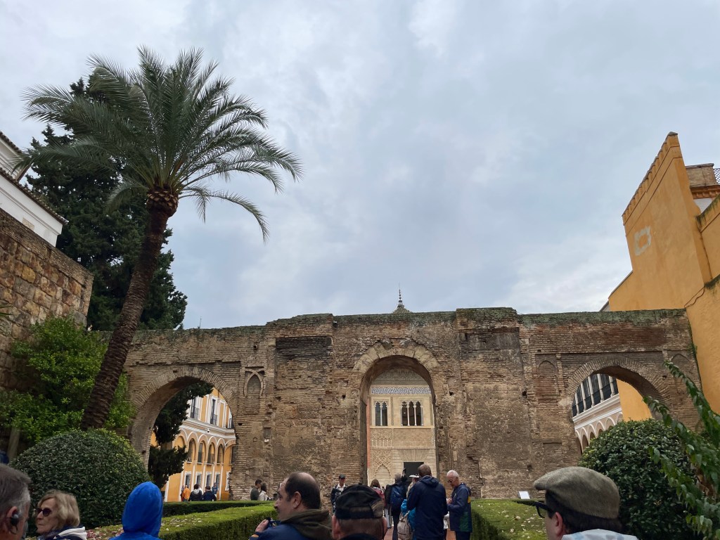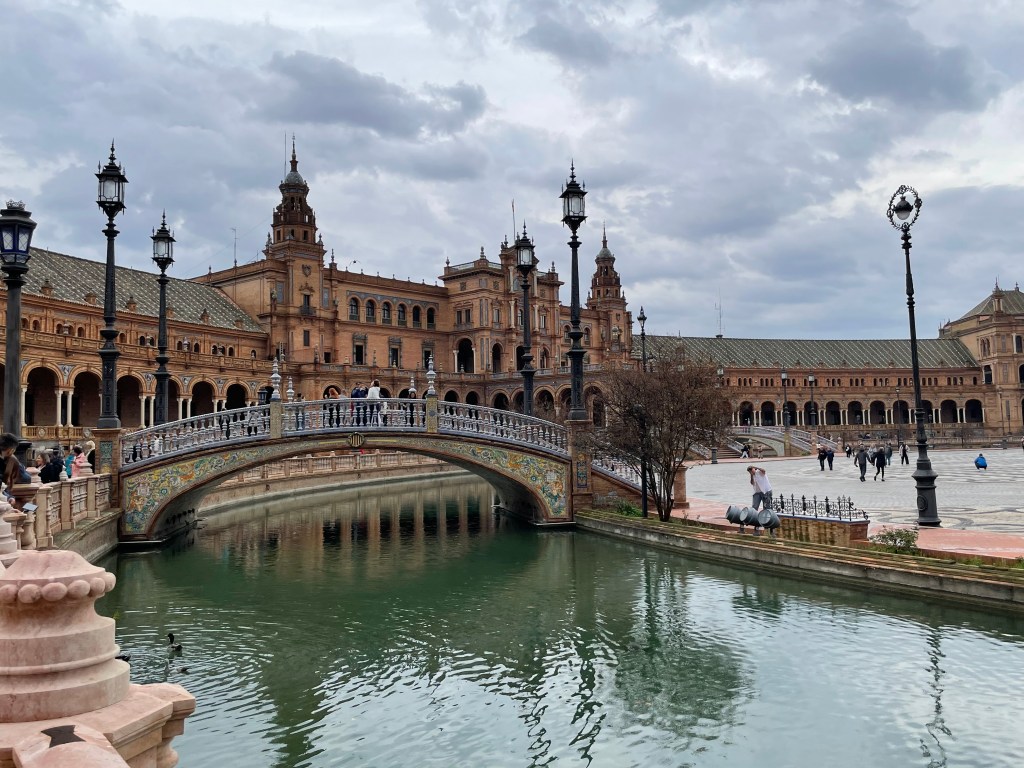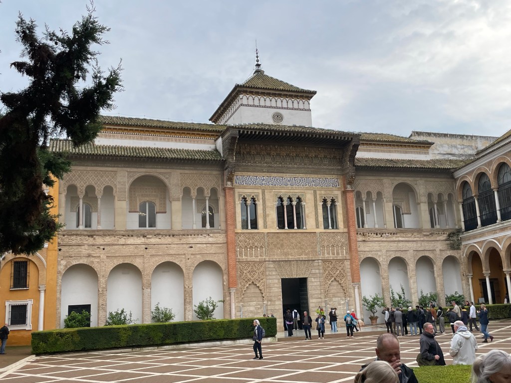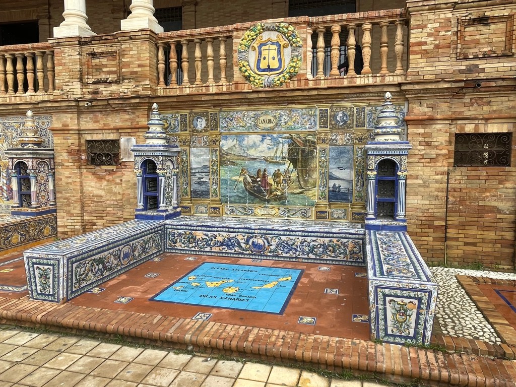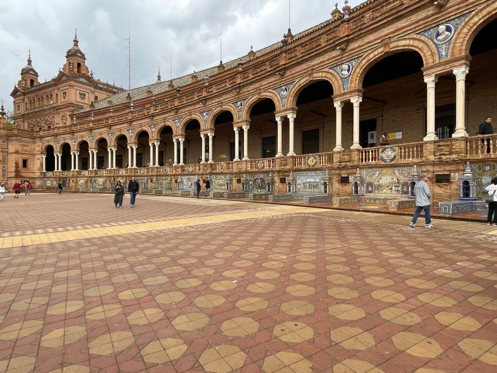 We arrived in Sevilla to no rain. It was still cloudy, but with some blue sky peeking out here and there. The bus was separated into three groups. Our group leader was not the same as the bus guide. We had Pepe. He gave us ear pieces so we could hear him well since there were a lot of groups everywhere we visited. Our first stop was the Plaza de España. We had about fifteen or twenty minutes to walk around and take pictures. I particularly liked the ornate benches with depictions of each Spanish province. The bus guide, Naomi, told us that Star Wars was filmed in that plaza with Natalie Portman. It was a beautiful and impressive place.