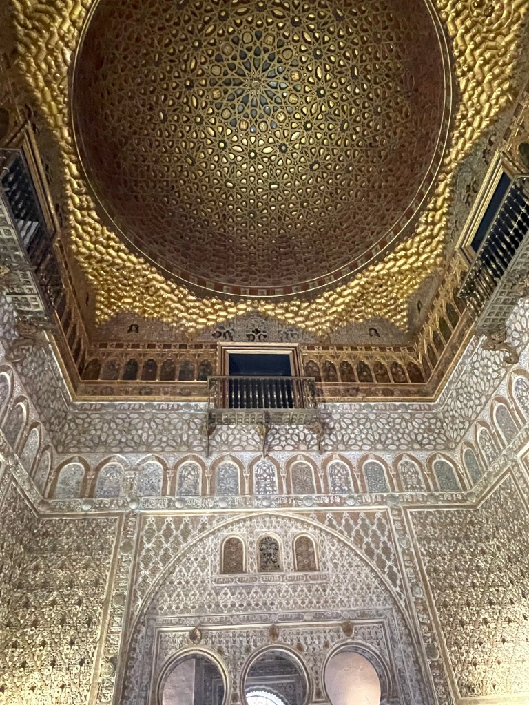 We entered the Alcazar and it reminded me so much of La Alhambra in Granada. There was a similar patio with the lane of water reflecting the area. There were beautiful gardens and the decorations were very similar. The addition of the coat of arms of Castilla y León to make it a palace for the royal family was interesting to see.
