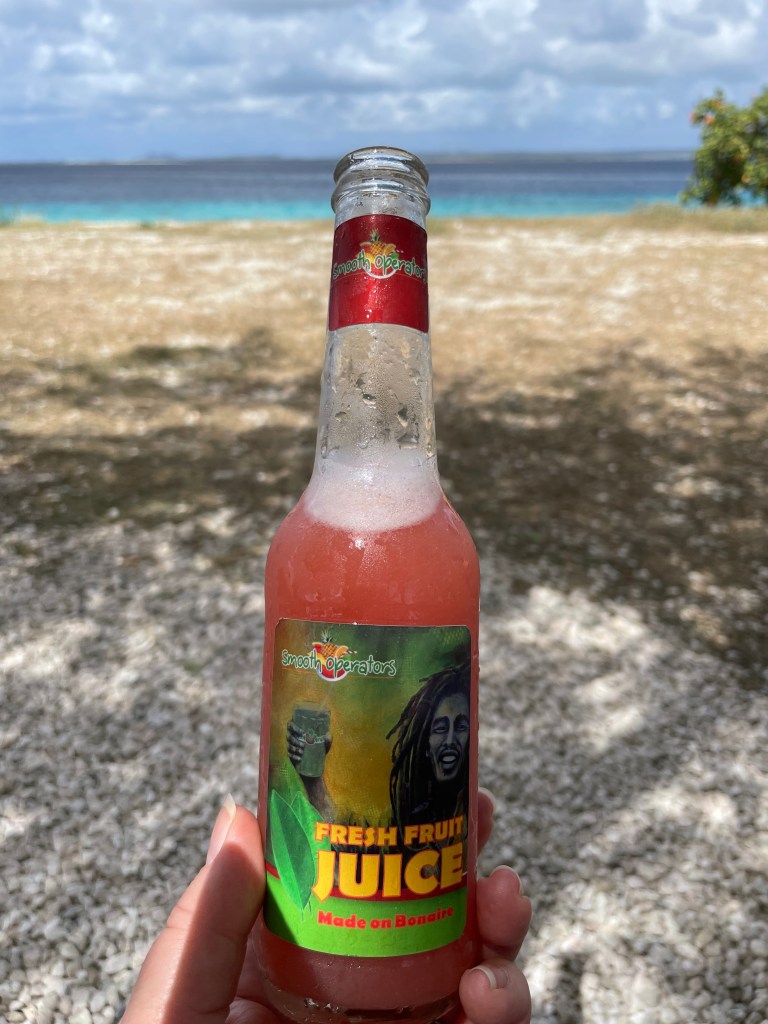 We stopped at the artesanal bakery and I got an iced coffee. It was made with oat milk and the coffee was delicious. We had lunch at a food truck that served lion fish burgers. I was so excited because I have wanted to try lion fish for a long time. If you don’t know, they are an invasive species and are destroying native plants and fish, so people hunt them. They are doing a good job of it in Bonaire, but it’s a bit of a losing battle. My sandwich was so good. They put spinach and tomato and shredded cheese. I think she put something on the fish itself. It was white and flaky and very mild flavored. We also tried some local guava juice which was also very tasty. The view from our lunch spot was so pretty.