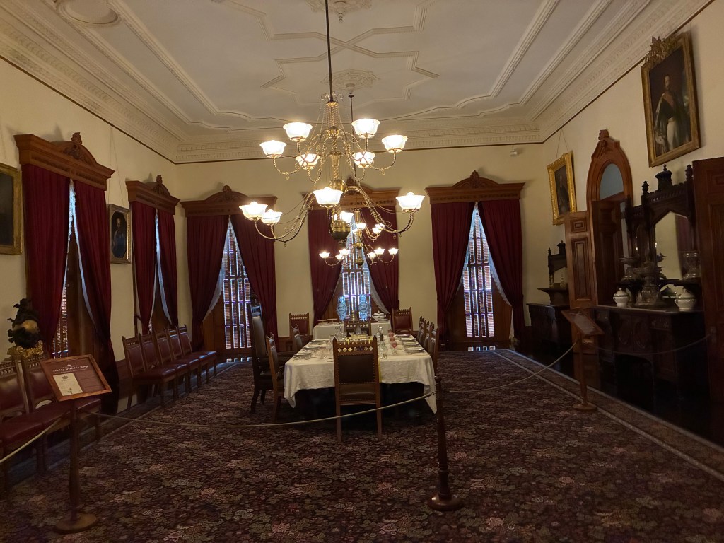 The dining room was interesting because the king put his chair in the middle so he could talk to all his guests. (You always see king’s chair at the end of the table in other palaces.)