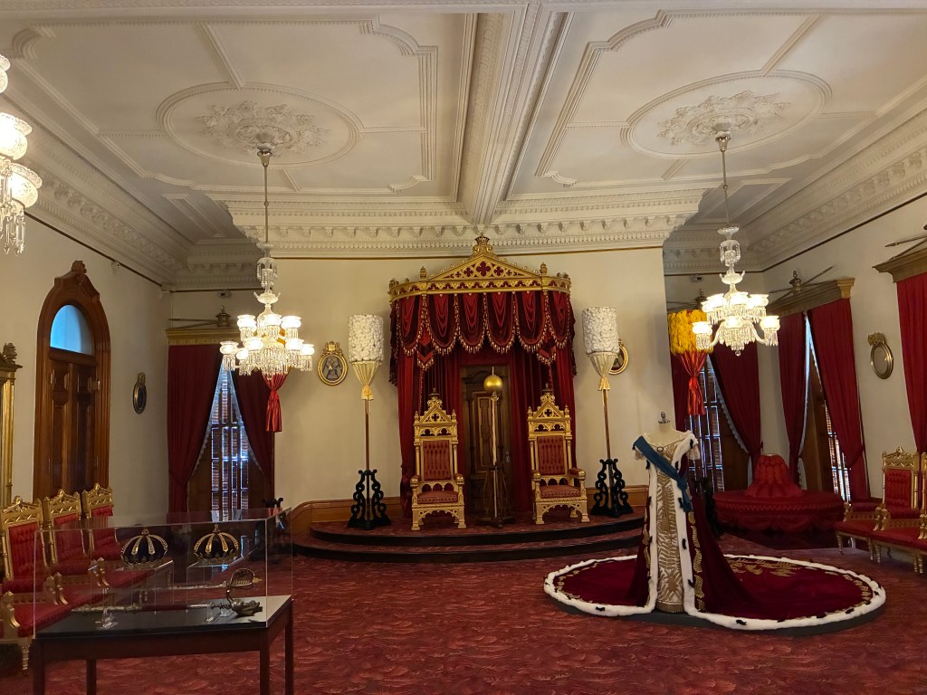 The throne room was impressive. I loved the cape on display and all around the room were coats of arms of different countries.