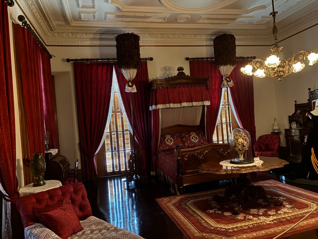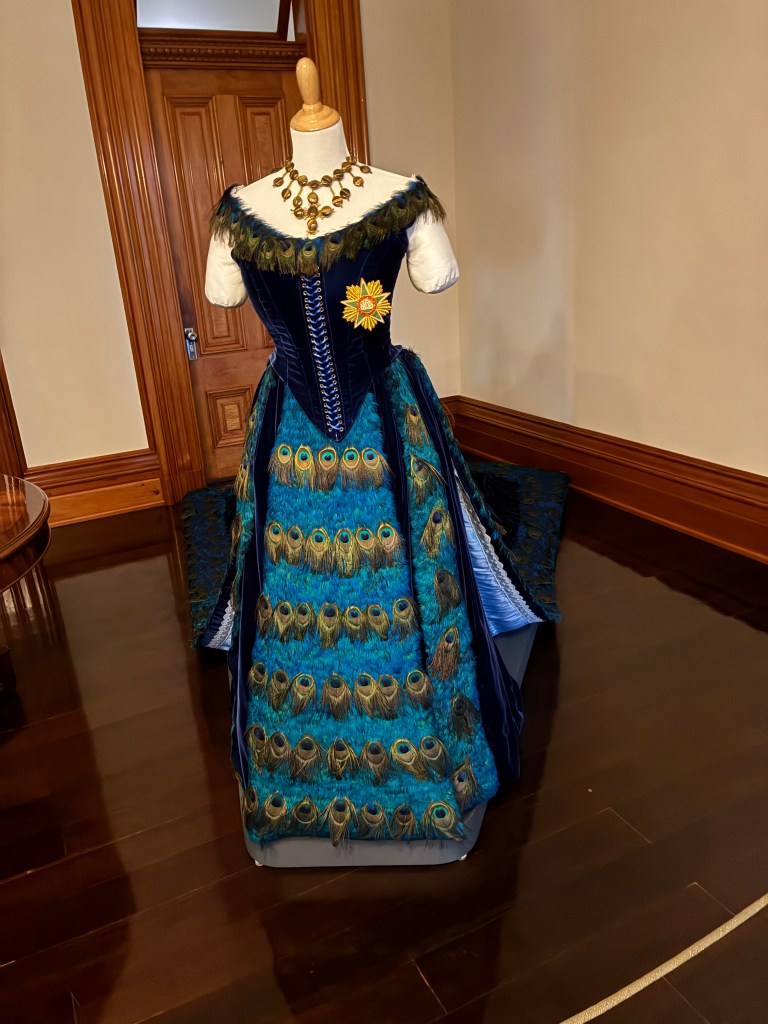 The queen’s room appeared very comfortable. I loved the peacock dress on display (especially after reading that birds were not killed to make their feather displays or gowns).