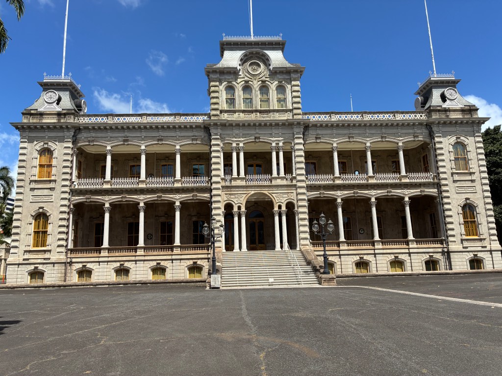 We parked in a parking garage to visit the Iolani Palace. There are parking spaces in front of it, but there are not many and we didn’t want to chance it. When we arrived there was a band playing right outside. We found out later that it plays there every Friday. It cost $52 for the both of us to tour the palace. We paid online, but picked up our tickets in the building with the gift shop. They have restrooms, but you have to ask for the code.